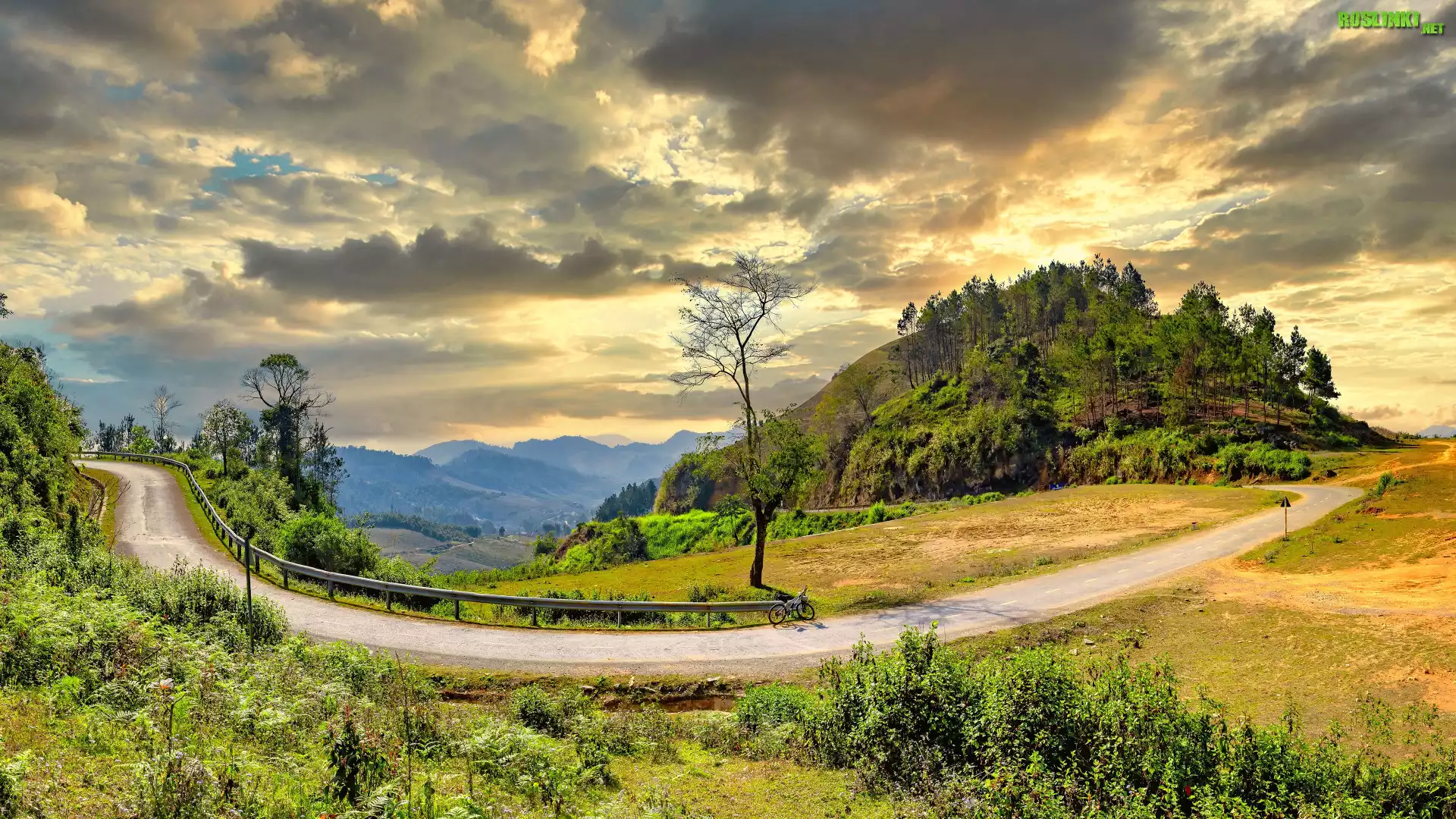 Rośliny: Góry, Droga, Drzewa, Niebo, Chmury Łąka