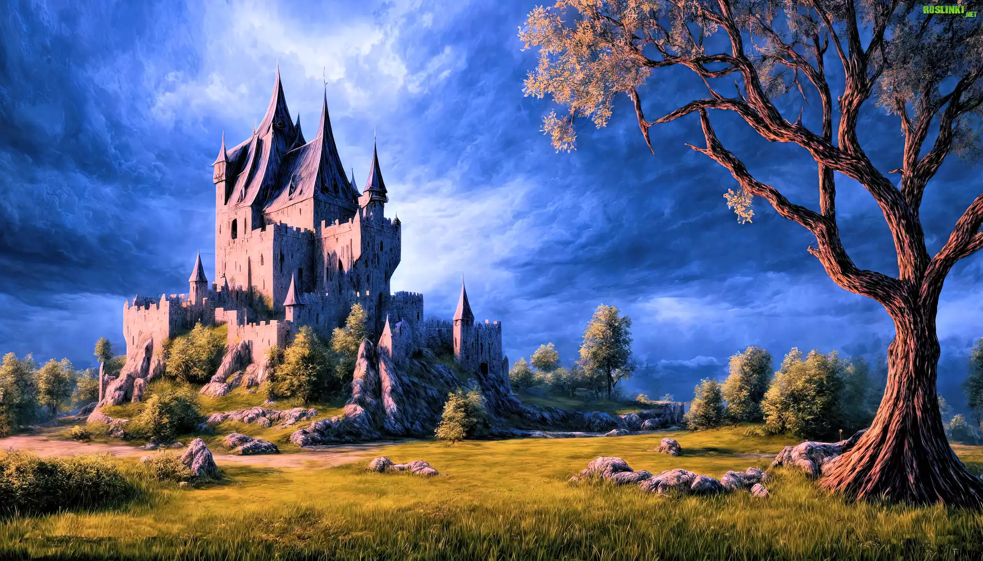Rośliny: Zamek, Drzewa, Polana, Niebo, Chmury, Paintography