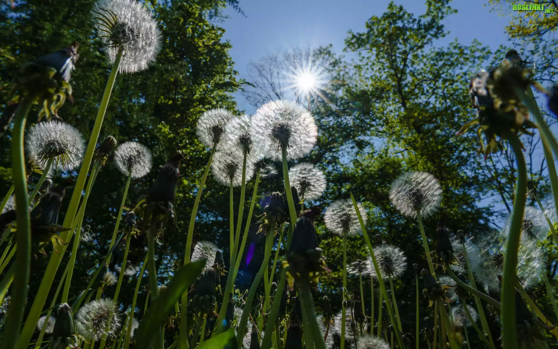 Rośliny: Drzewa, Kwiaty, Dmuchawce, Niebo, Promienie słońca