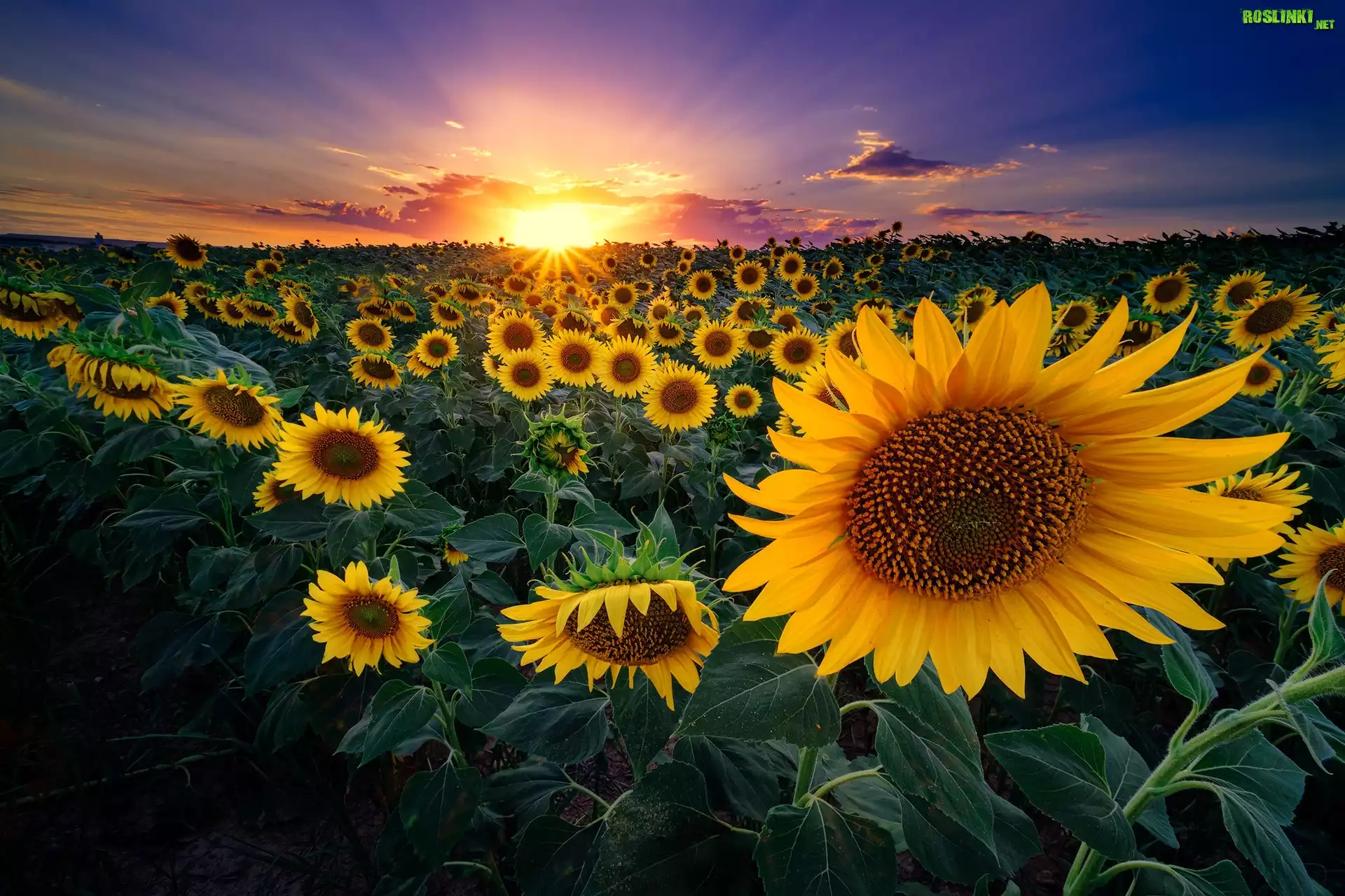 Rośliny: Pole, Kwiaty, Słoneczniki, Niebo, Zachód słońca