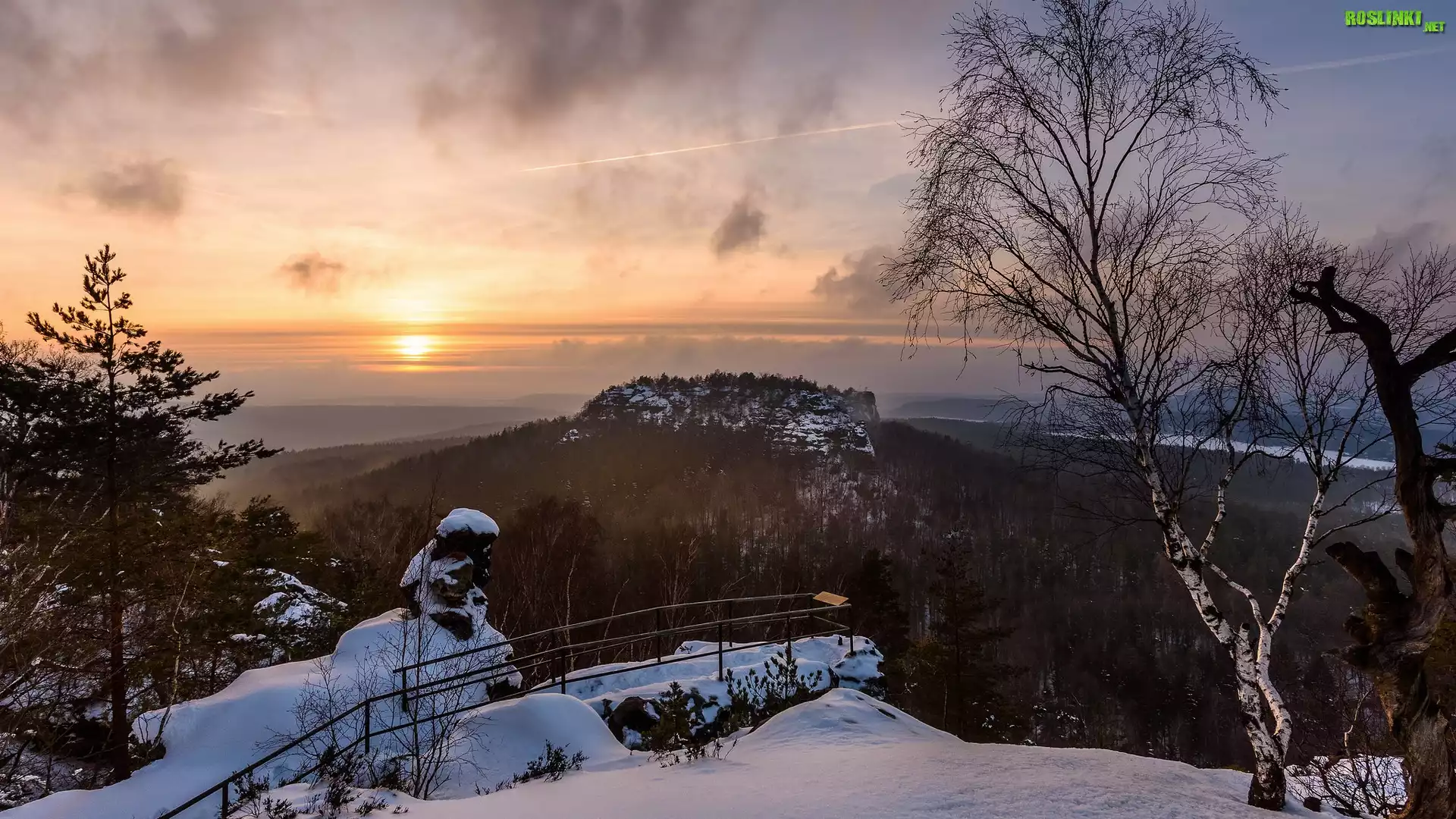 Rośliny: Zima, Śnieg, Góry, Zachód słońca, Drzewa, Brzoza