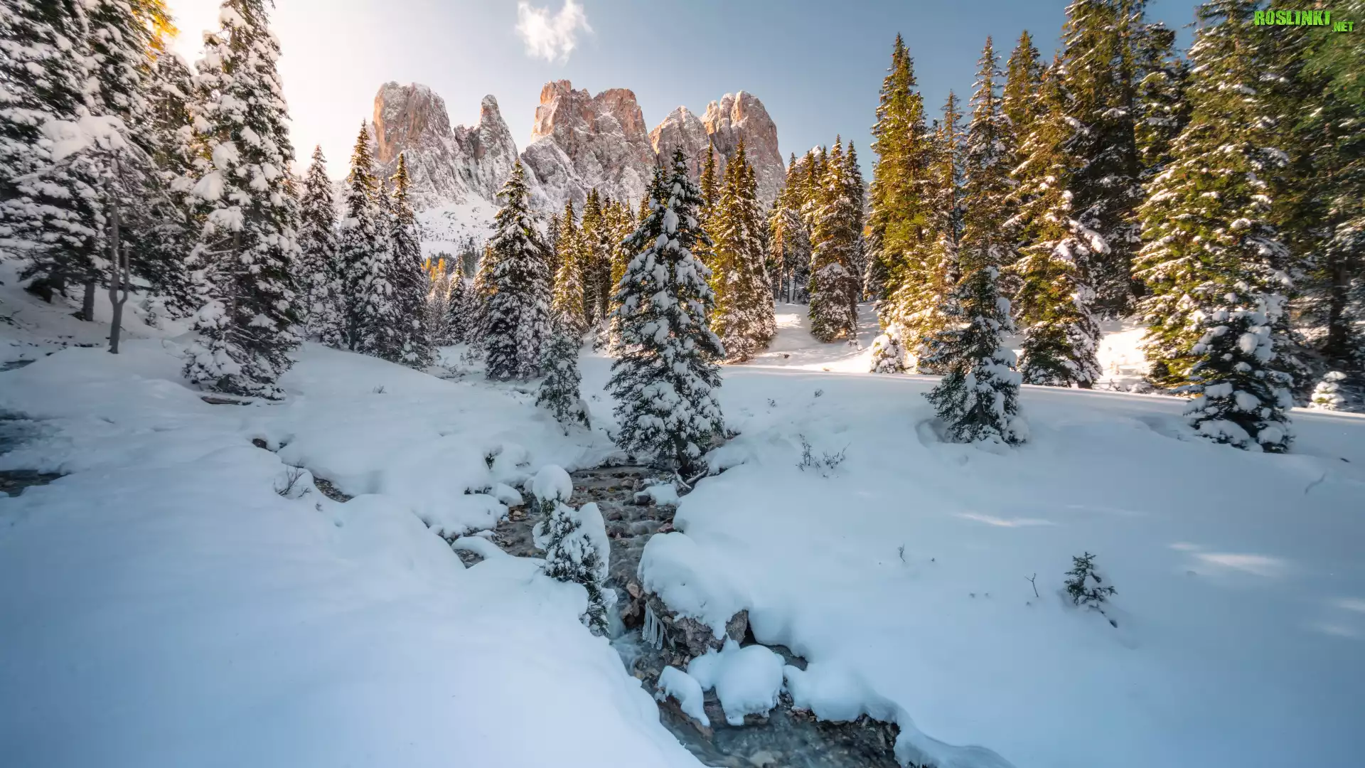 Rośliny: Zima, Śnieg, Drzewa, Las, Ośnieżone, Strumyk, Góry