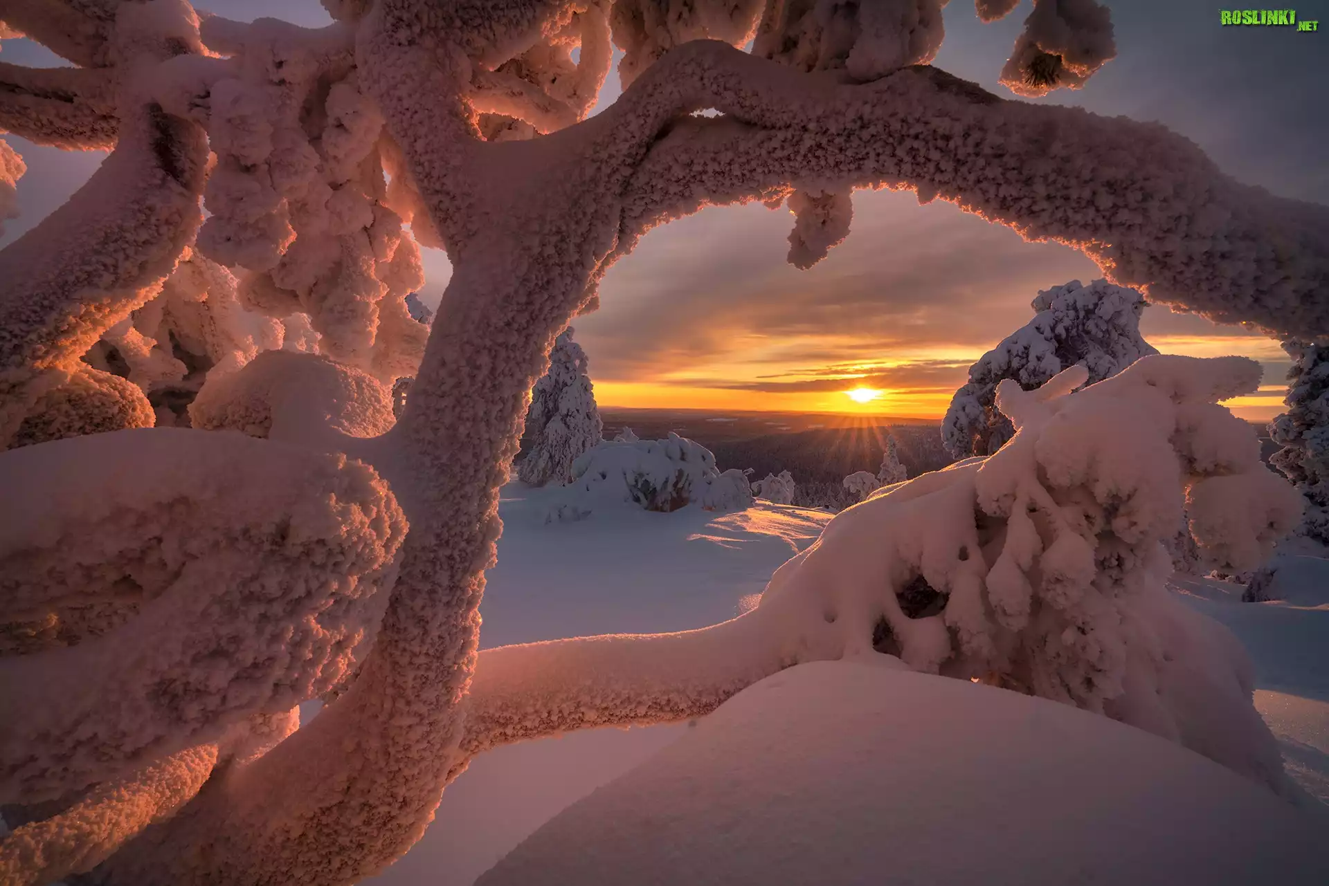 Rośliny: Zima, Śnieg, Promienie słońca, Szron, Drzewa, Konary