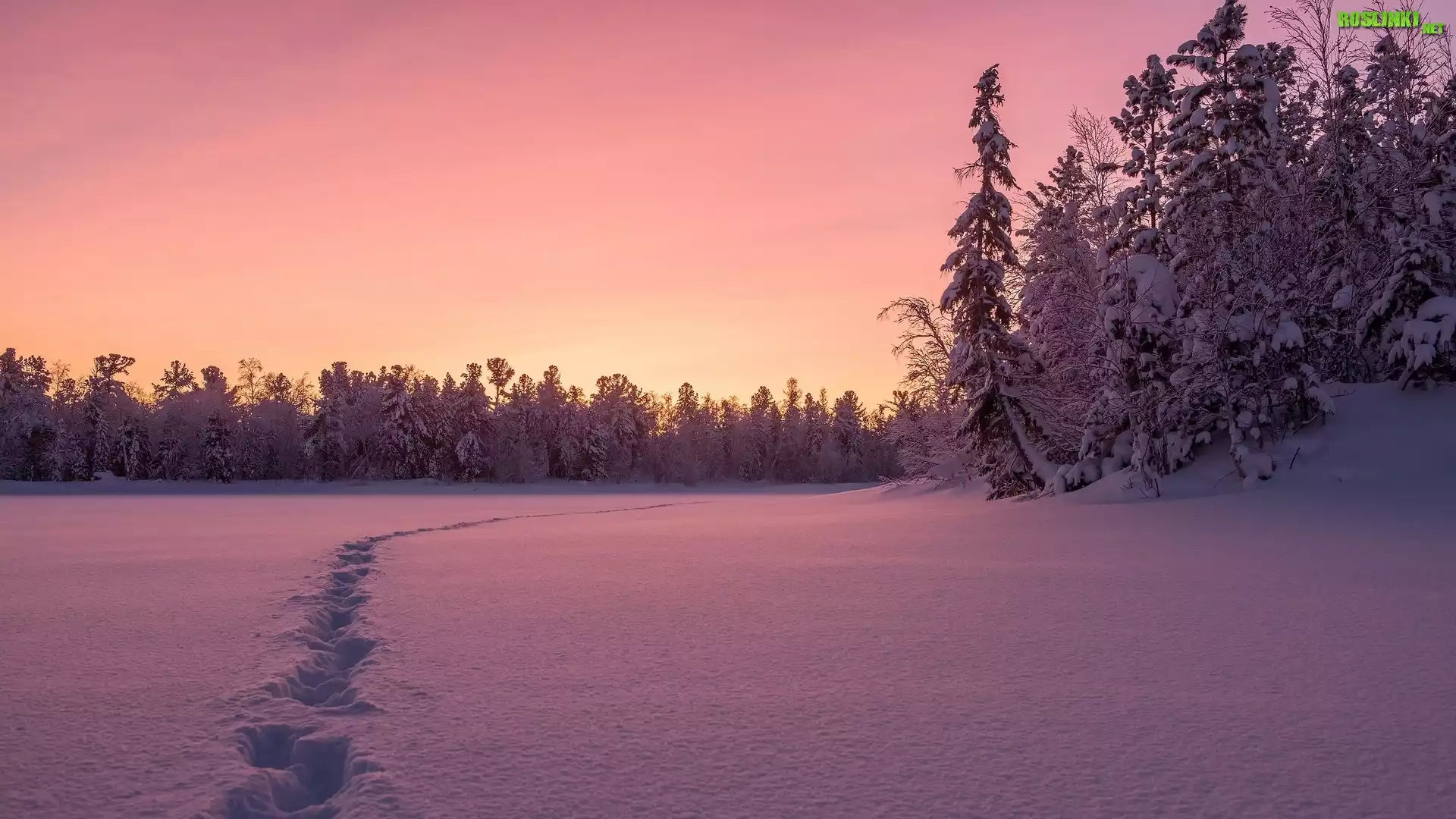 Rośliny: Zima, Śnieg, Las, Drzewa, Zachód słońca, Ślady