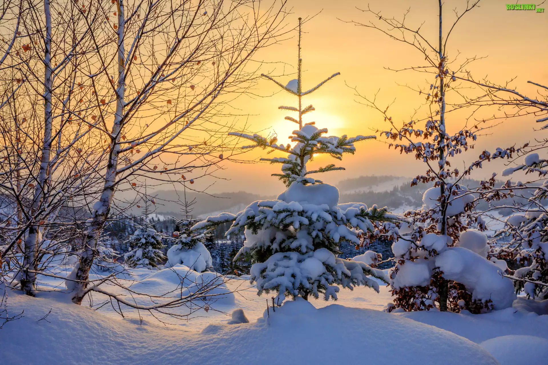 Rośliny: Las, Śnieg, Drzewa, Zaspy, Mgła, Zachód słońca, Zima