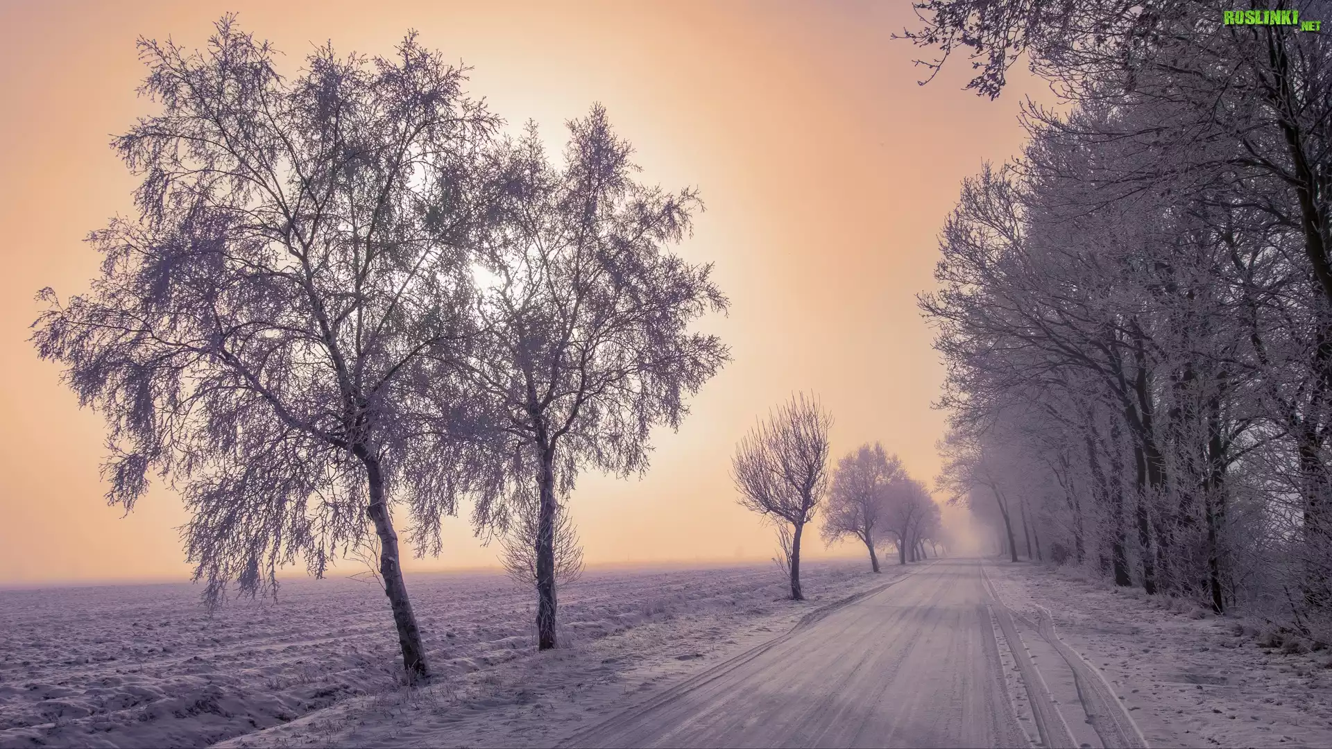Rośliny: Zima, Śnieg, Droga, Drzewa, Pola, Szron, Mgła