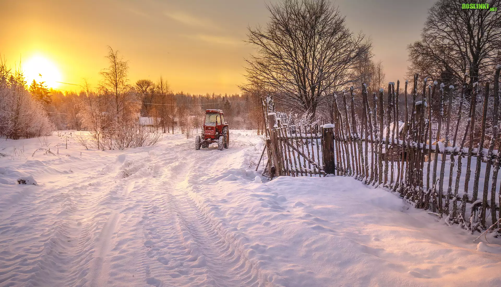 Rośliny: Zima, Śnieg, Traktor, Ogrodzenie, Drzewa, Promienie słońca