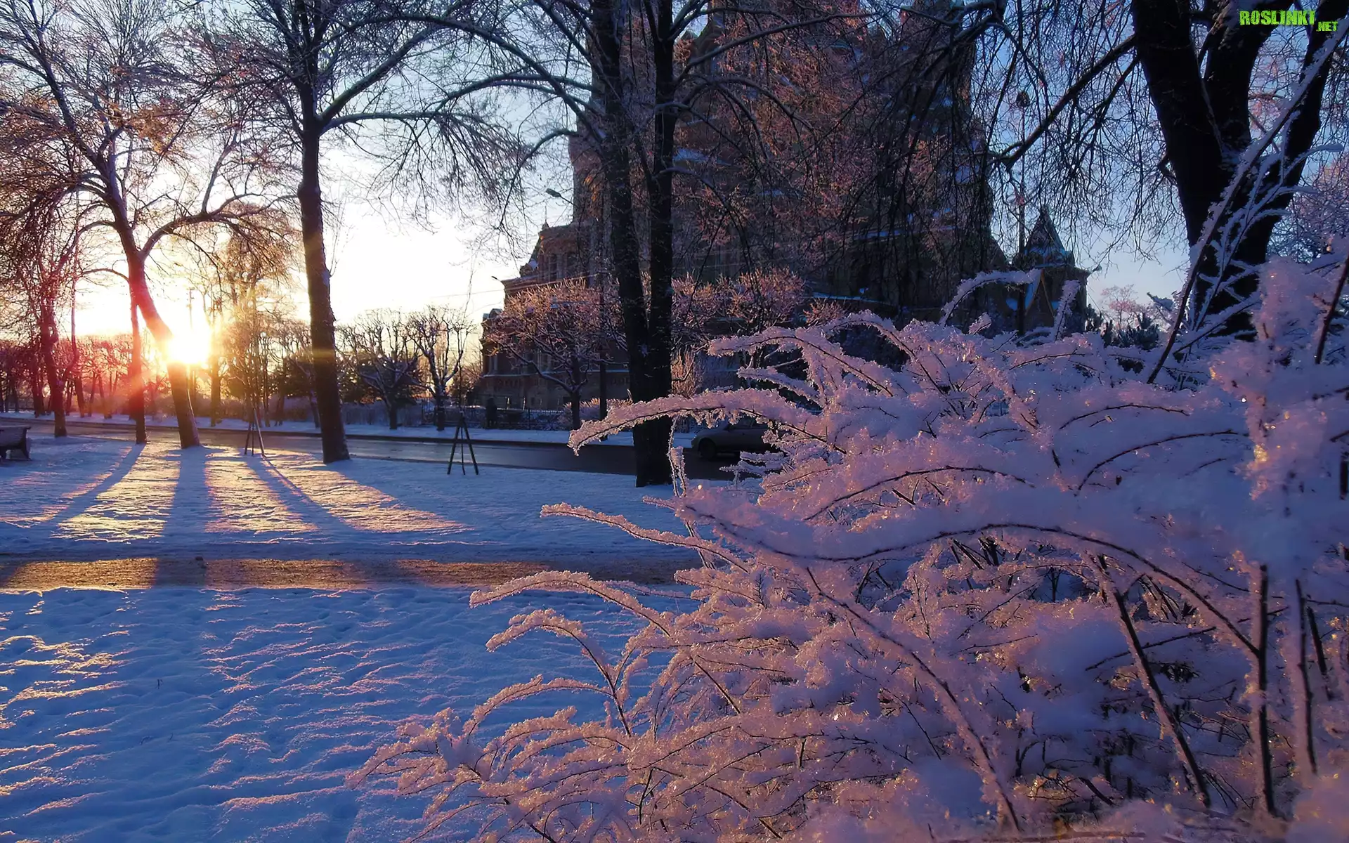 Rośliny: Zima, Śnieg, Dom, Drzewa, Krzewy, Promienie, Słońca