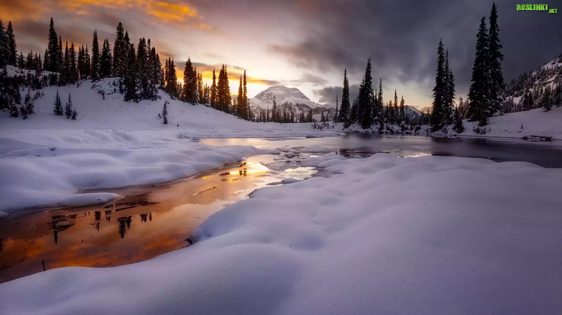 Zima, Śnieg, Jezioro Tipsoo Lake, Góry, Stratowulkan Mount Rainier, Drzewa, Zachód słońca, Park Narodowy Mount Rainier, Stan Waszyngton, Stany Zjednoczone |