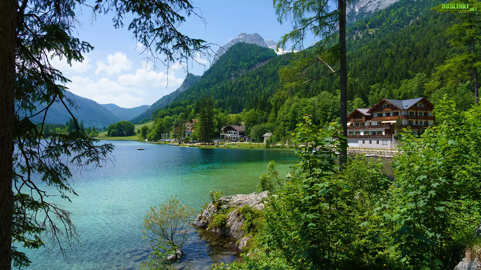 Rośliny: Jezioro Hintersee, Góry Alpy, Drzewa, Domy, Gmina Berchtesgadener, Bawaria, Niemcy