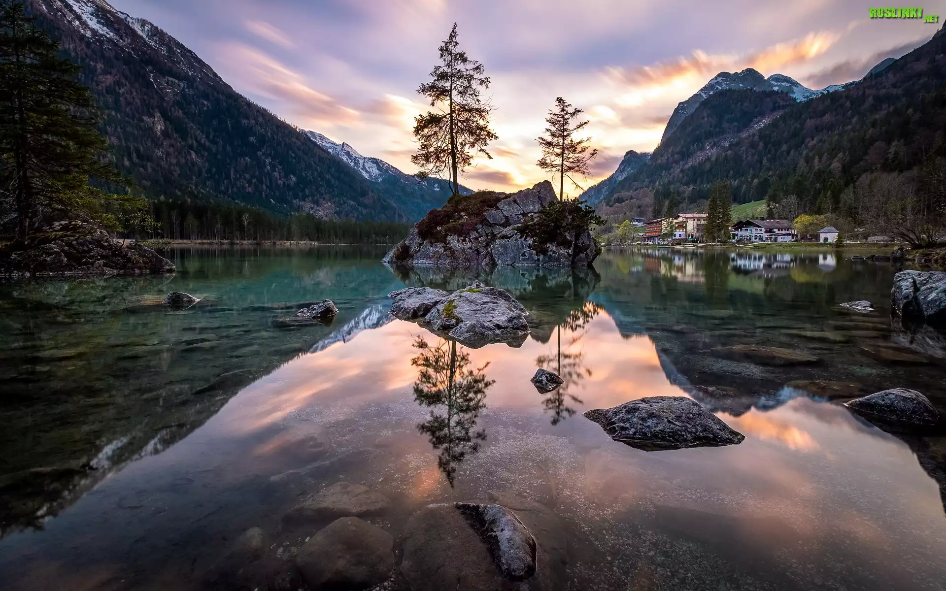 Rośliny: Góry, Jezioro Hintersee, Skały, Drzewa, Odbicie, Gmina Berchtesgadener, Bawaria, Niemcy