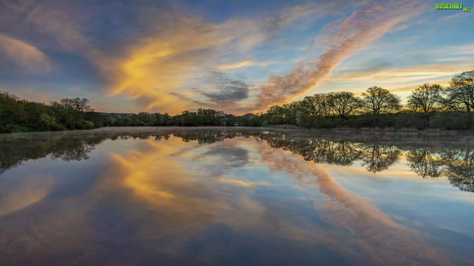 Rośliny: Wschód słońca, Drzewa, Jezioro Sterenbachsee, Dolina Wittlicha, Niemcy