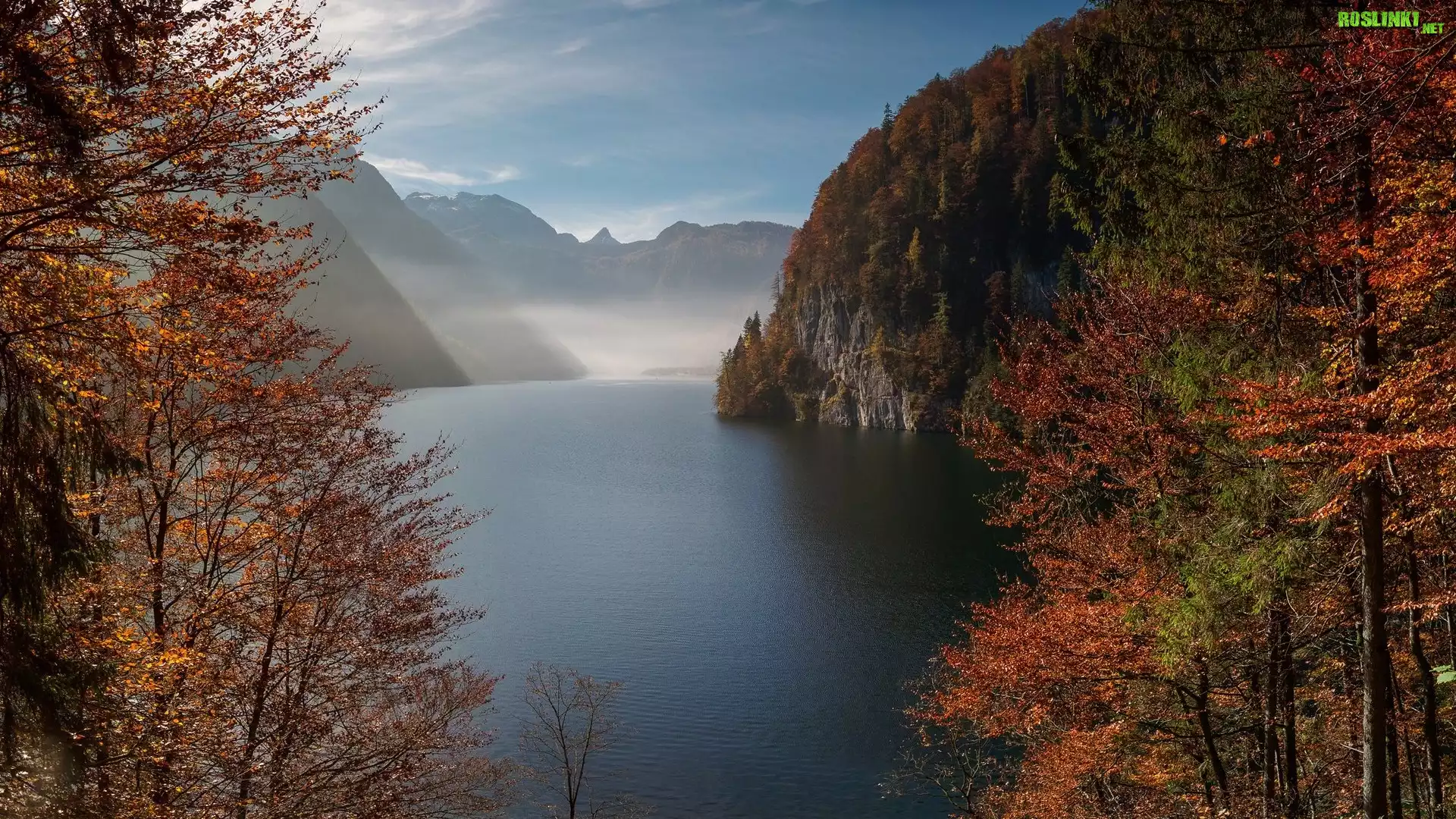 Rośliny: Jesień, Góry, Jezioro, Konigssee, Drzewa, Mgła, Bawaria, Niemcy