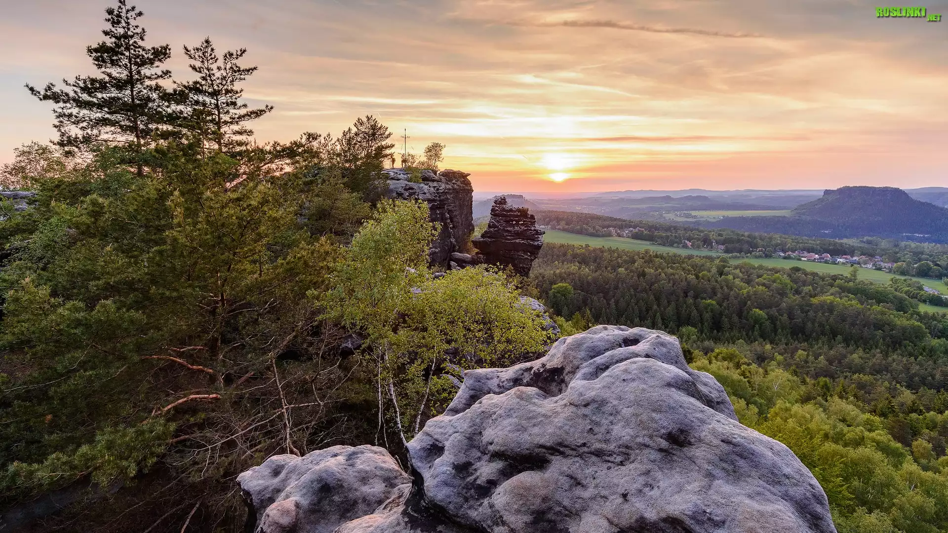 Wschód słońca, Drzewa, Skały, Park Narodowy Saskiej Szwajcarii, Skały, Niemcy