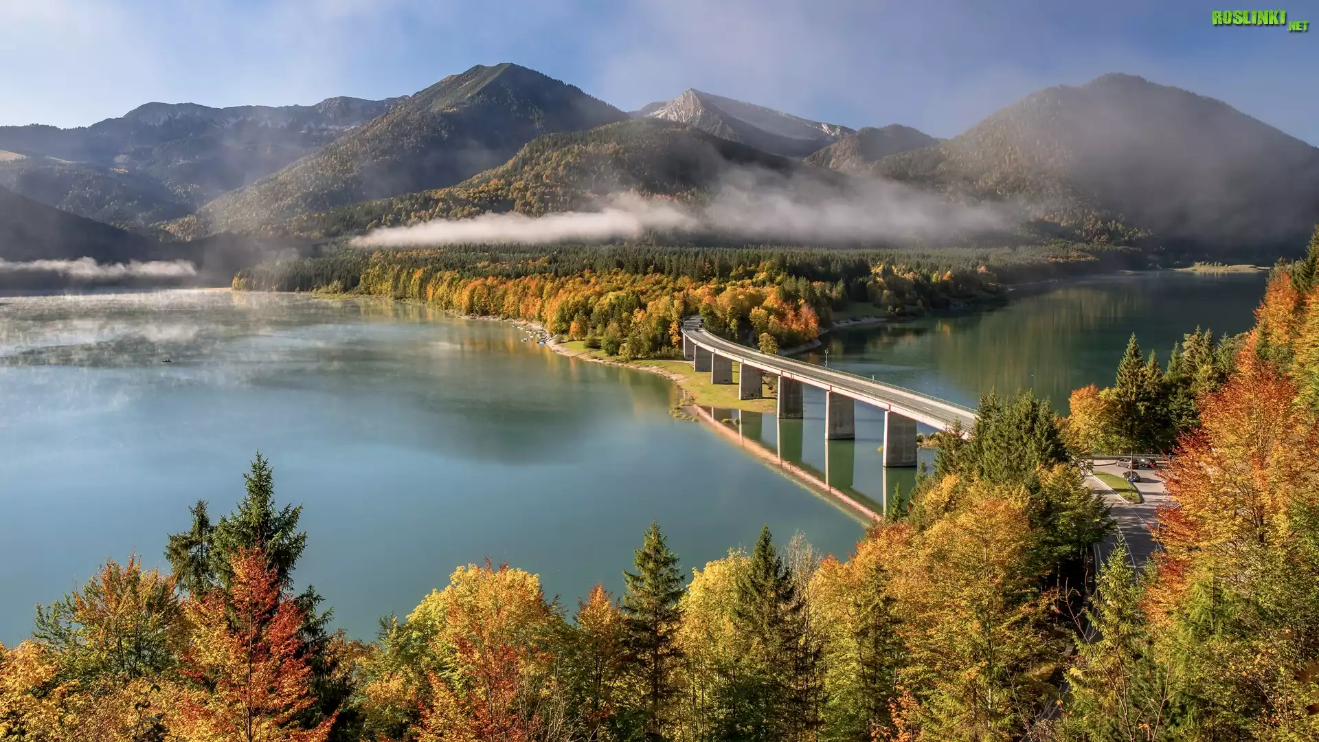 Rośliny: Góry, Jezioro Sylvensteinsee, Most, Drzewa, Jesień, Mgła, Bawaria, Niemcy