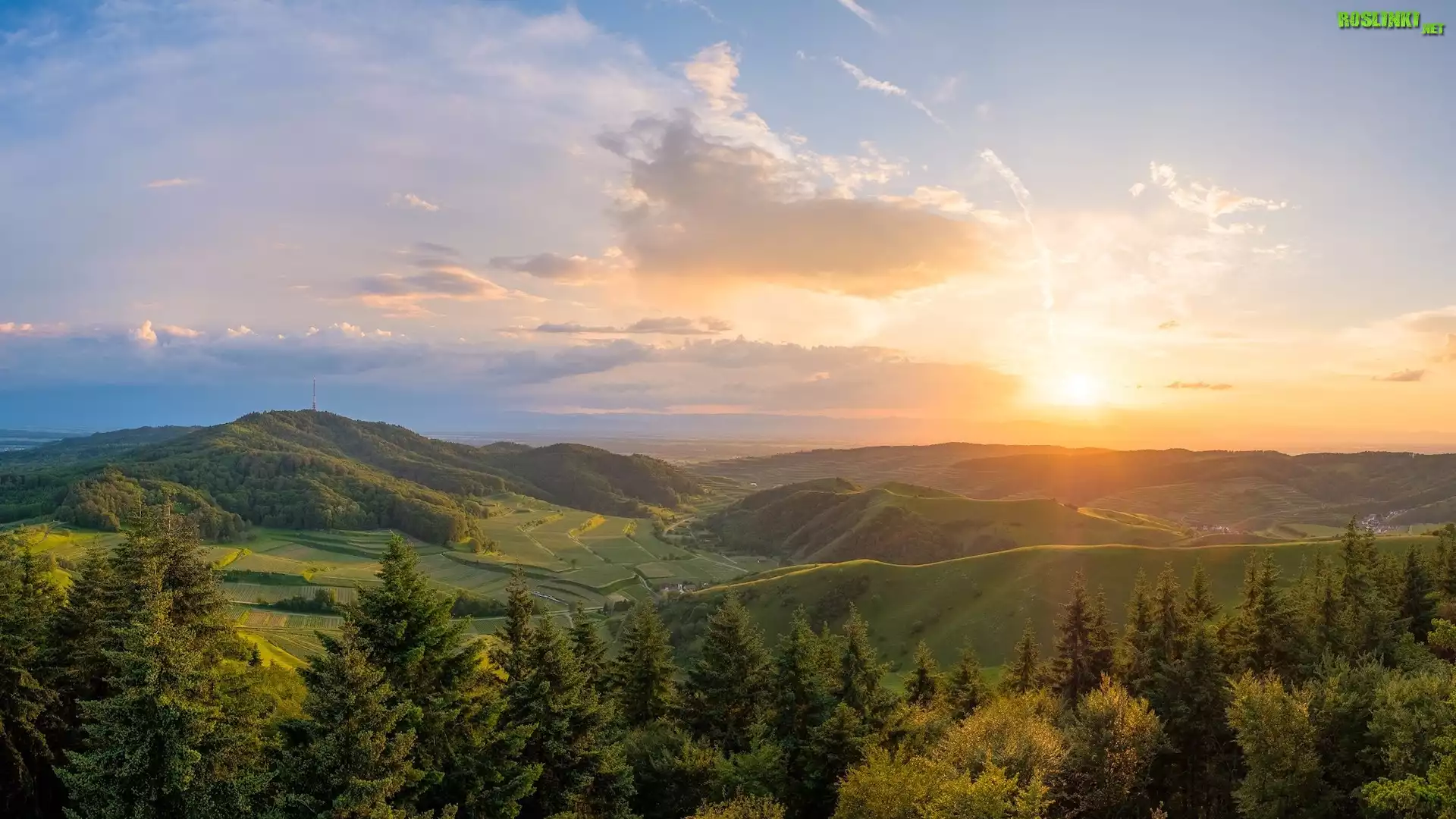 Rośliny: Promienie słońca, Wzgórza, Pola, Drzewa, Las, Góry, Kaiserstuhl, Niemcy