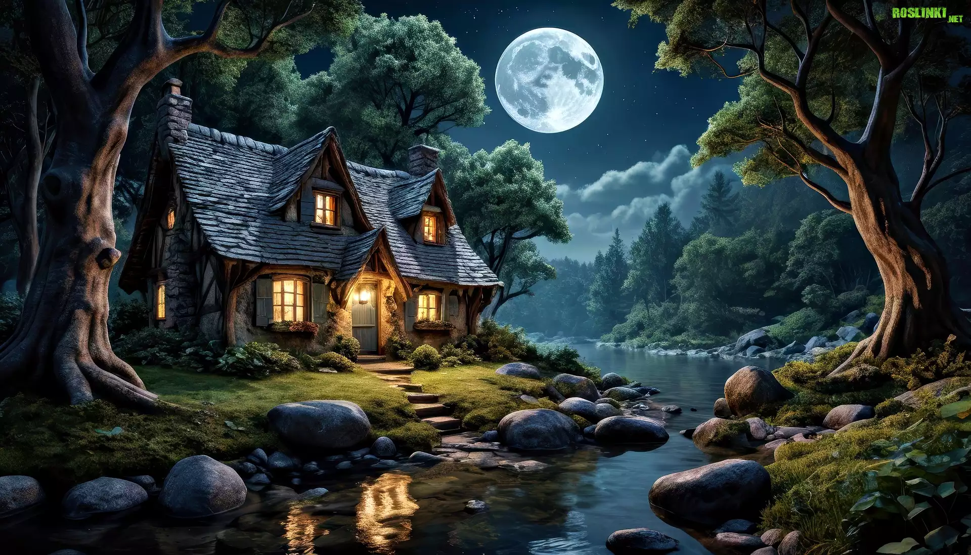 Rośliny: Rzeka, Drzewa, Dom, Noc, Grafika, Księżyc