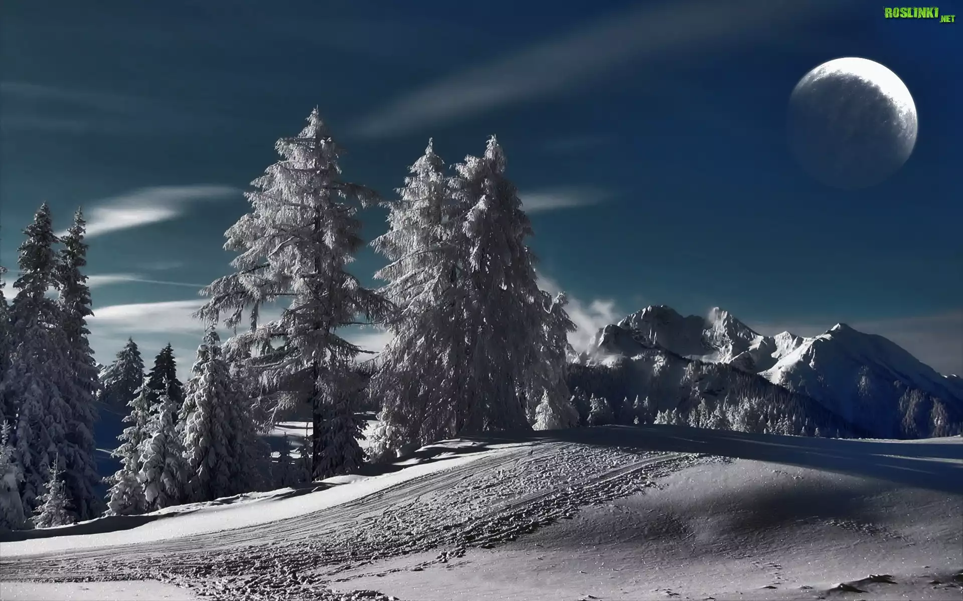 Rośliny: Noc, Góry, Drzewa, Księżyc, Śnieg