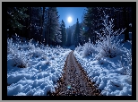 Noc, Zima, Las, Śnieg, Drzewa, Droga, Księżyc, Oszronione, Rośliny, AI