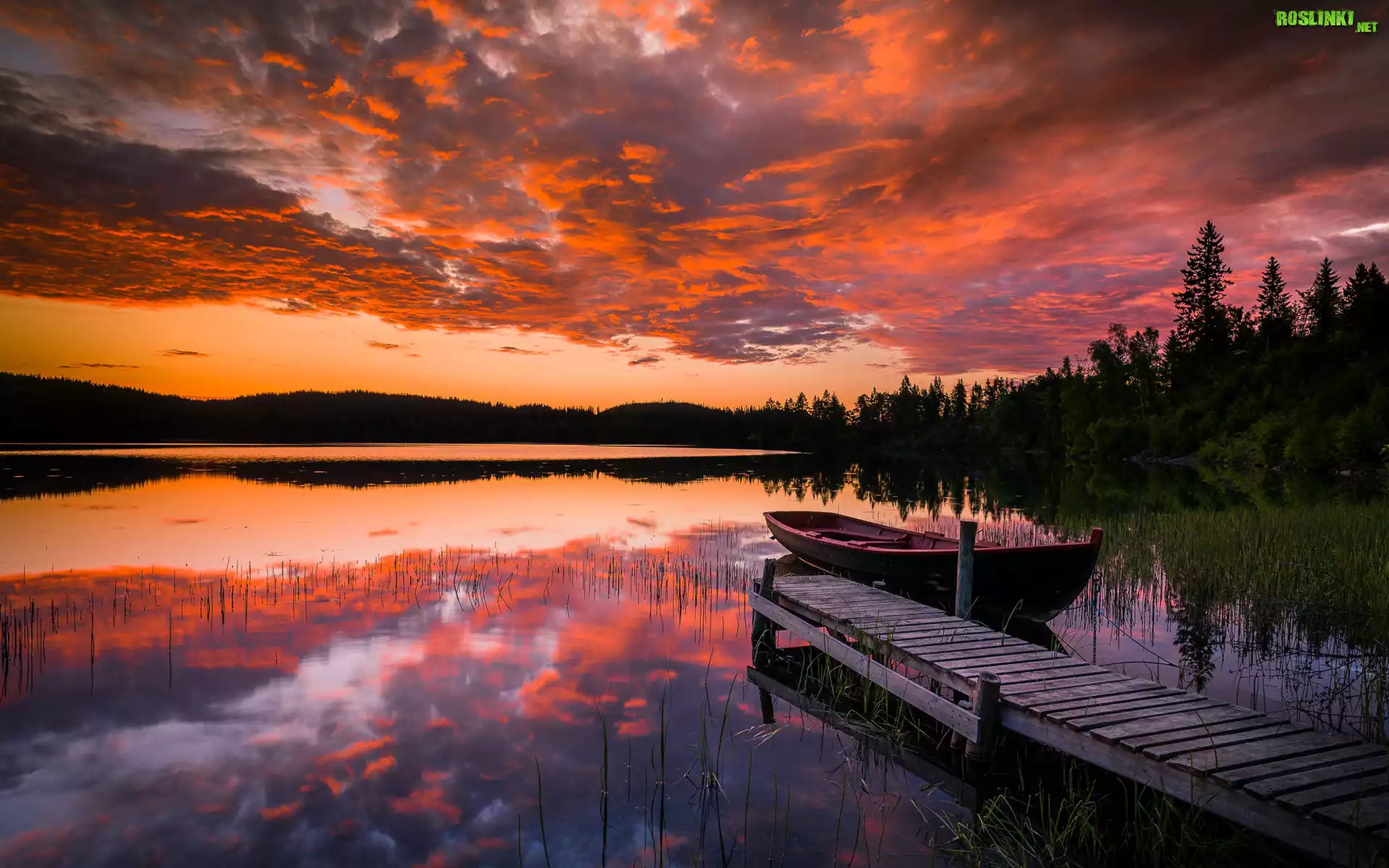 Norwegia, Region Sor Trondelag, Miasto Trondheim, Jezioro, Zachód słońca, Jezioro, Pomost, Łódka, Las, Drzewa, Chmury, Odbicie |