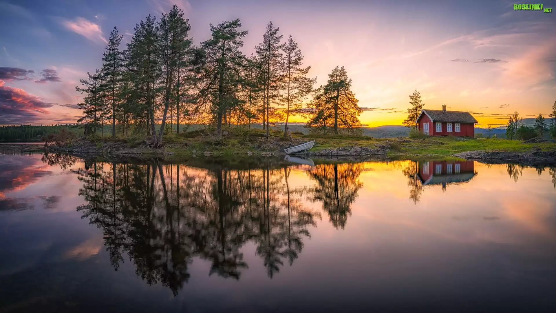Rośliny: Norwegia, Ringerike, Tyristrand, Jezioro, Vaeleren, Drzewa, Dom, Łódka, Odbicie