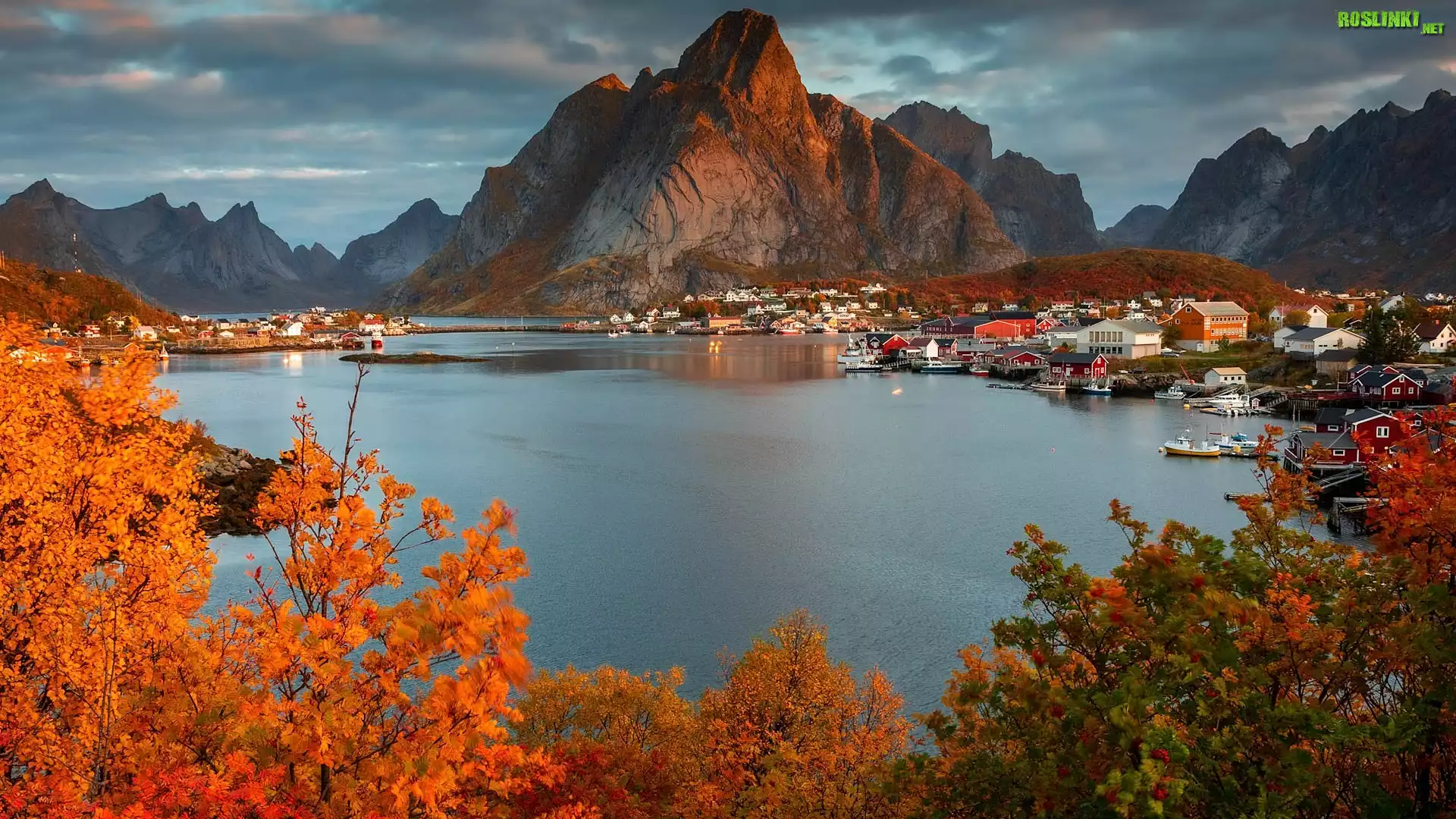 Rośliny: Norwegia, Lofoty, Hamnoy, Jesień, Morze, Góry, Skały, Domy, Drzewa, Rośliny