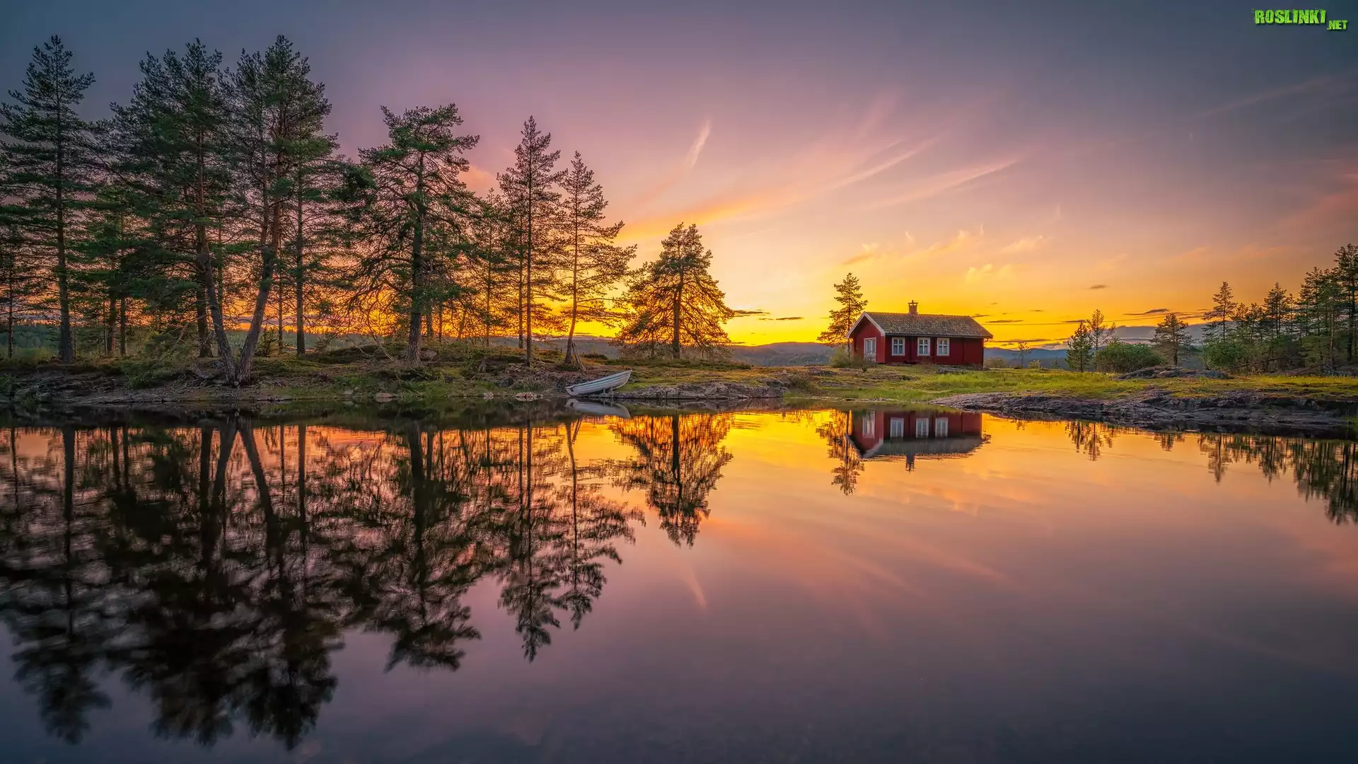 Rośliny: Norwegia, Ringerike, Tyristrand, Jezioro, Vaeleren, Drzewa, Dom, Odbicie, Wschód słońca
