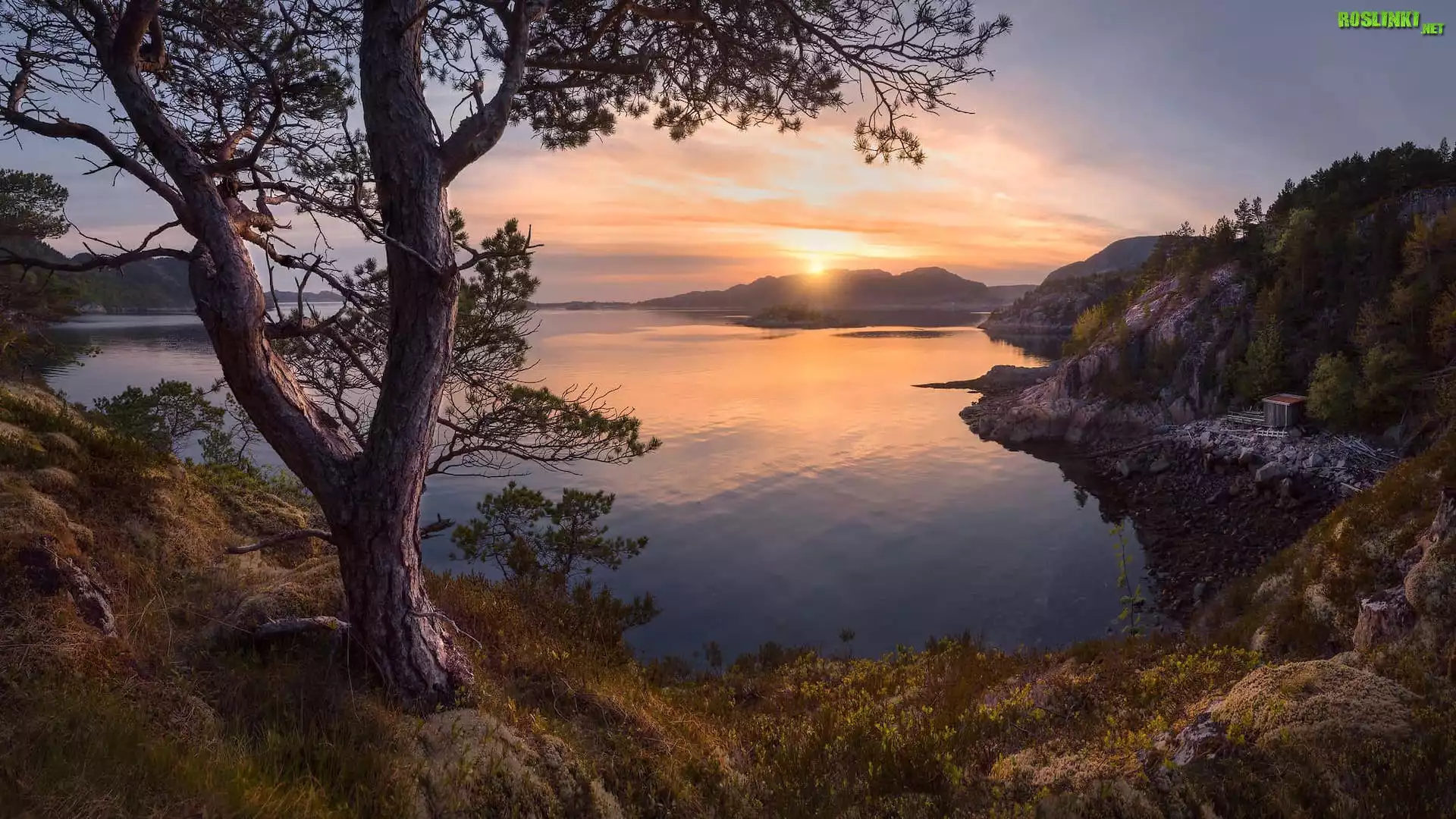 Rośliny: Jezioro, Zatoka, Wzgórza, Zachód słońca, Drzewo, Gmina Agdenes, Norwegia