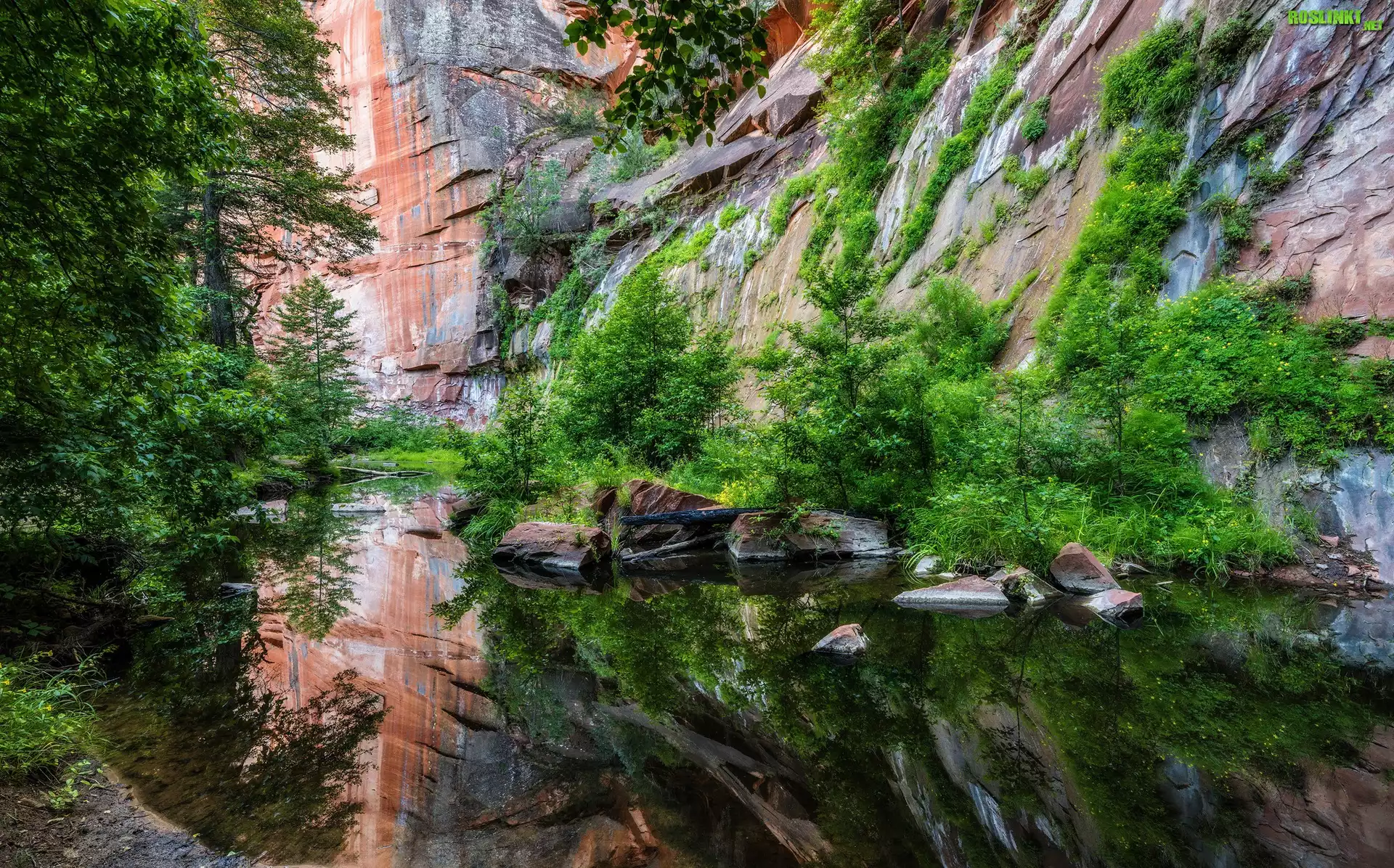 Rośliny: Stany Zjednoczone, Arizona, Sedona, Skały, Wąwóz, Oak Creek, Rzeka, Drzewa, Roślinność