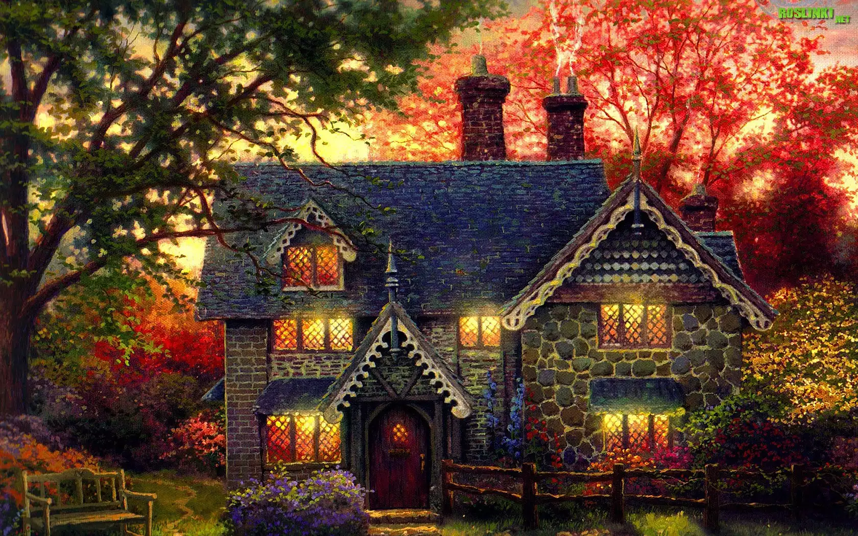Rośliny: Obraz, Dom, Drzewa, Ławka