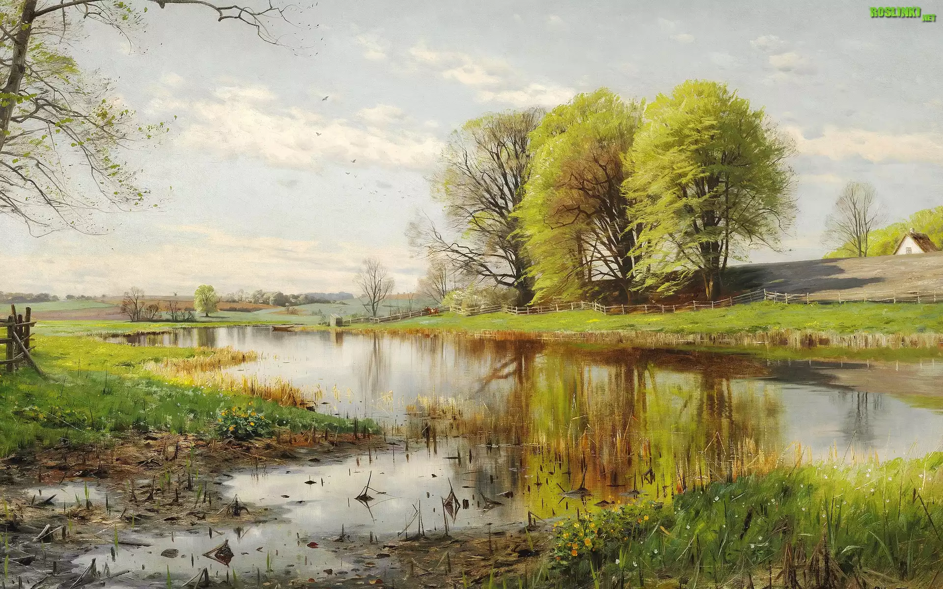 Rośliny: Obraz, Malarstwo, Peder Mork Monsted, Wieś, Wiosna, Pejzaż, Drzewa, Dom, Staw, Łódka, Krowa, Kwiaty, Ogrodzenie