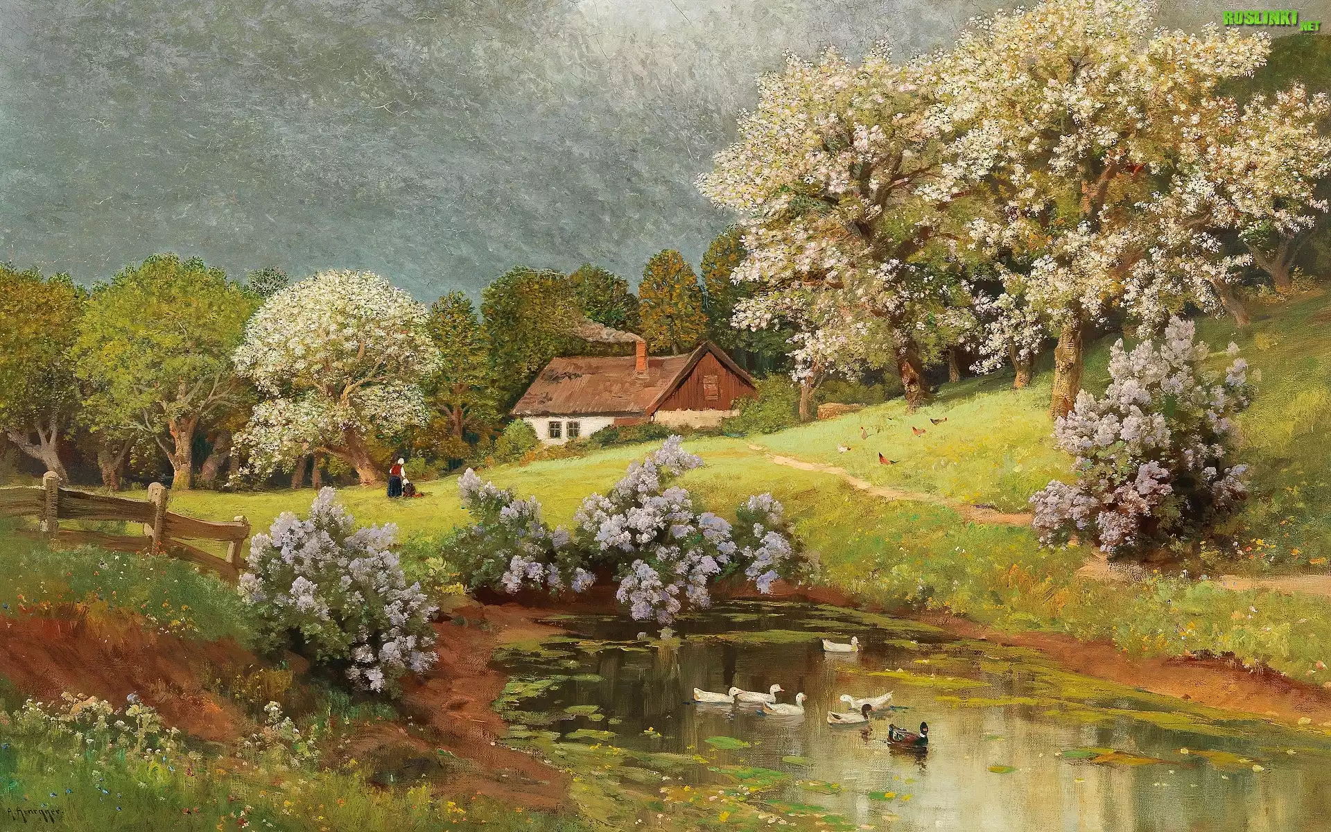 Rośliny: Obraz, Alois Arnegger, Malarstwo, Wieś, Wiosna, Staw, Kaczki, Dom, Drzewa, Krzewy, Bzy, Kury