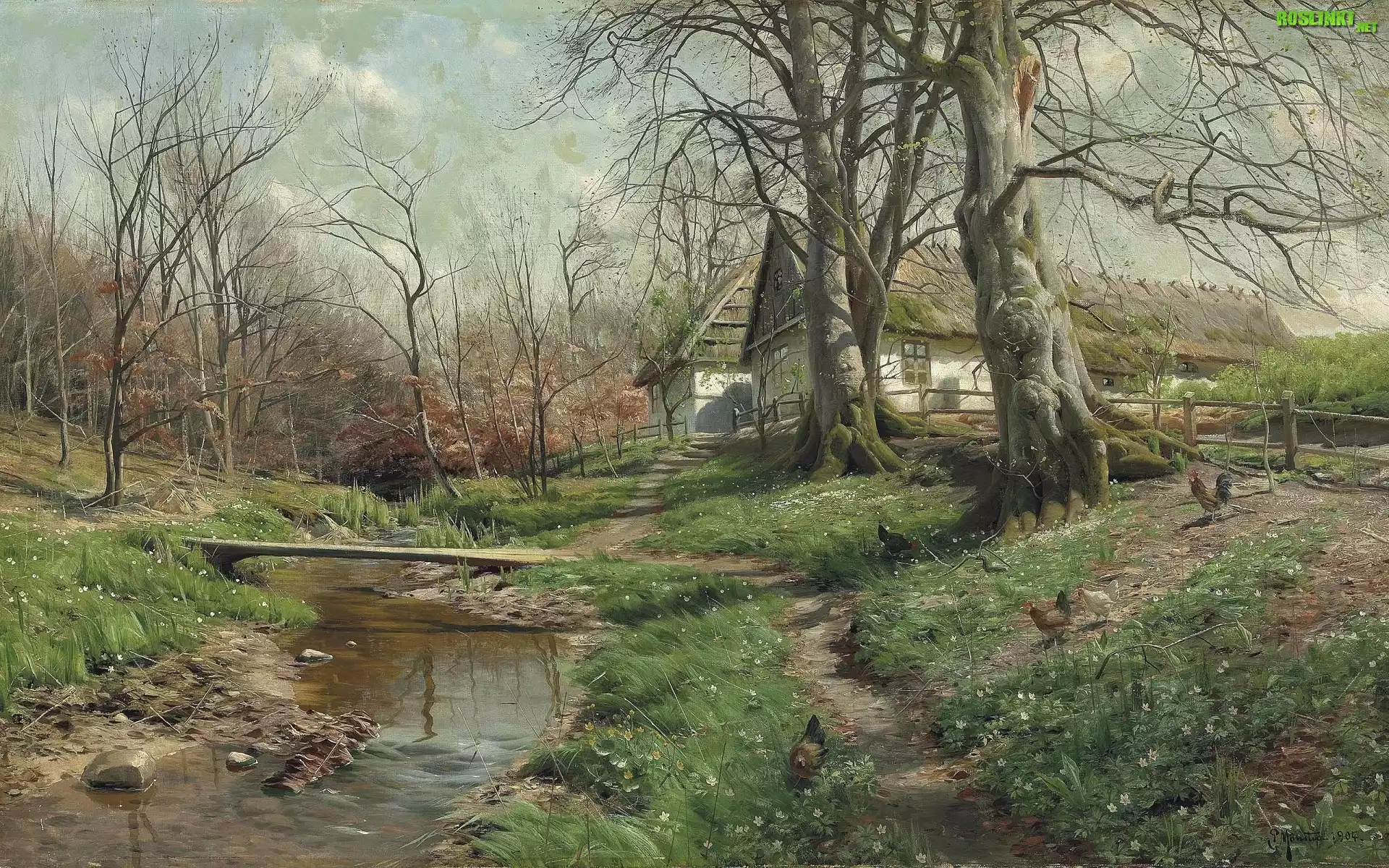 Obraz, Malarstwo, Wieś, Wiosna, Pejzaż, Kwiaty, Zawilce, Rzeka, Drewniana, Kładka, Drzewa, Domy, Kury, Peder Mork Monsted |