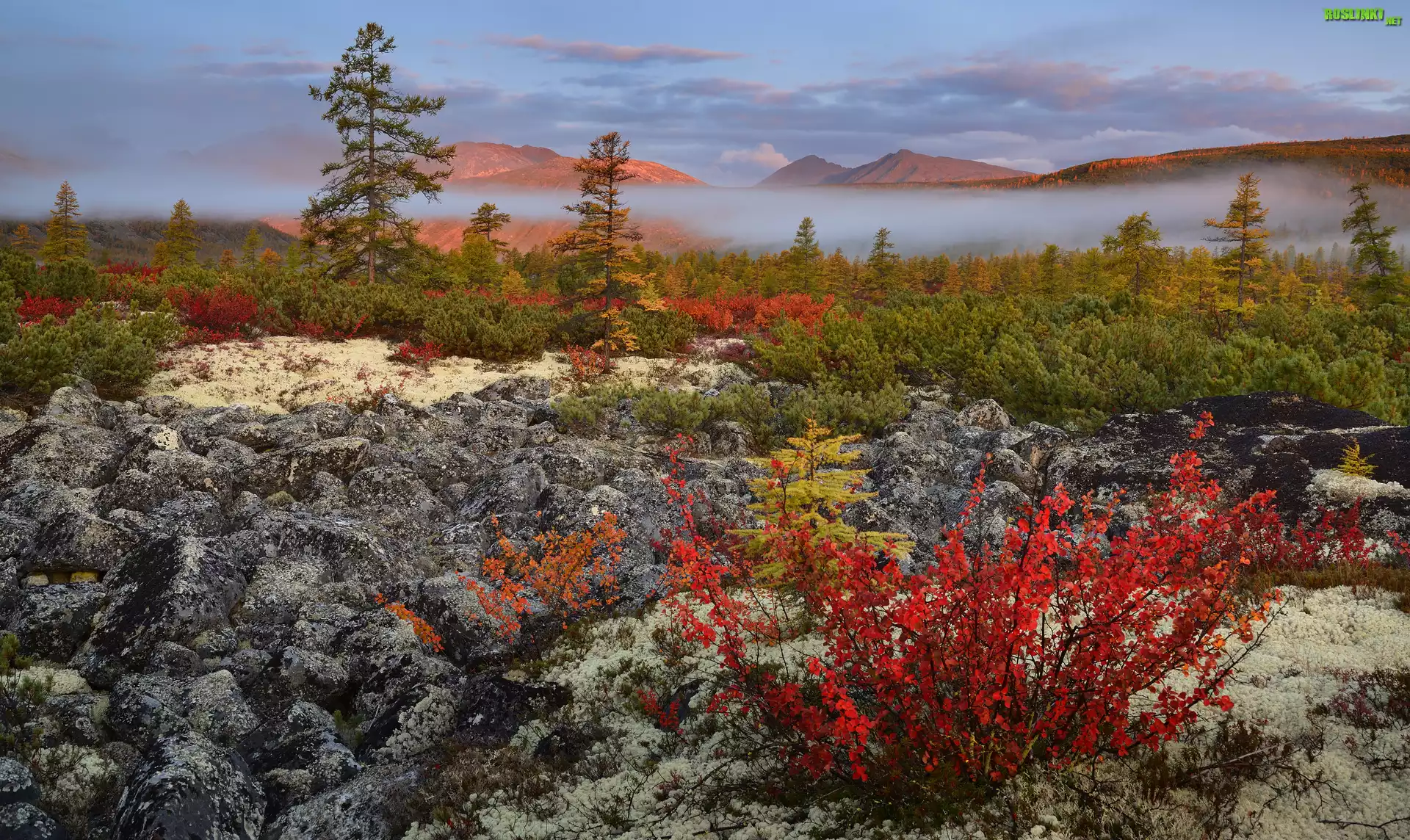 Rośliny: Jesień, Kołyma, Obwód magadański, Rosja, Góry, Mgła, Rośliny, Drzewa, Skały, Kamienie