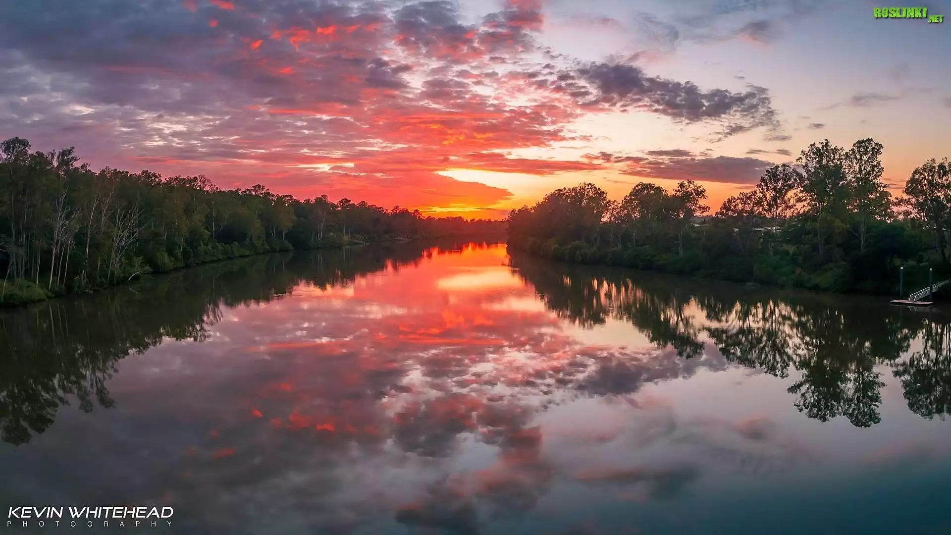 Rośliny: Wschód słońca, Jezioro, Odbicie, Drzewa, Chmury