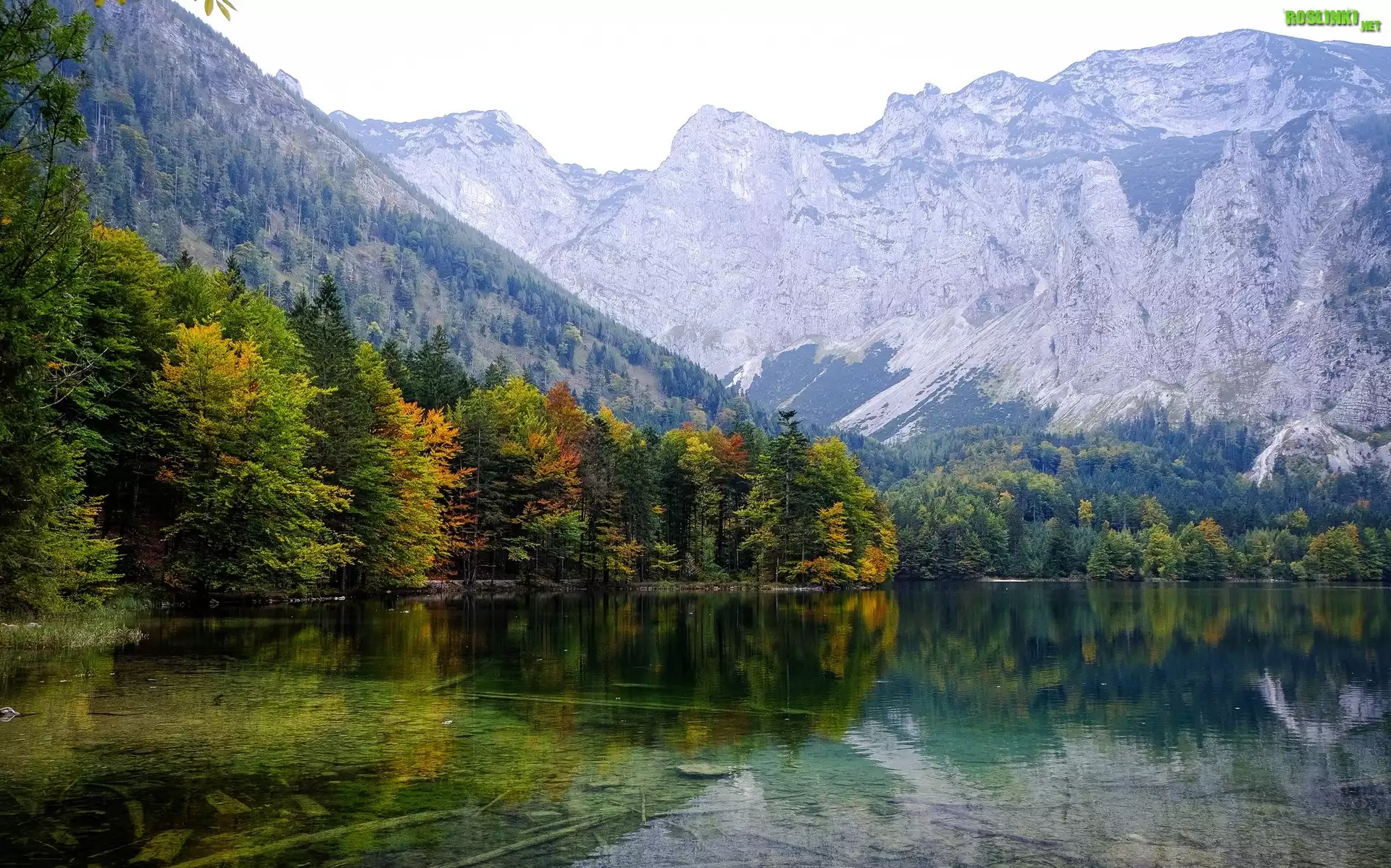 Rośliny: Austria, Gmina Ebensee, Jesień, Góry, Jezioro Hinterer Langbathsee, Drzewa, Odbicie