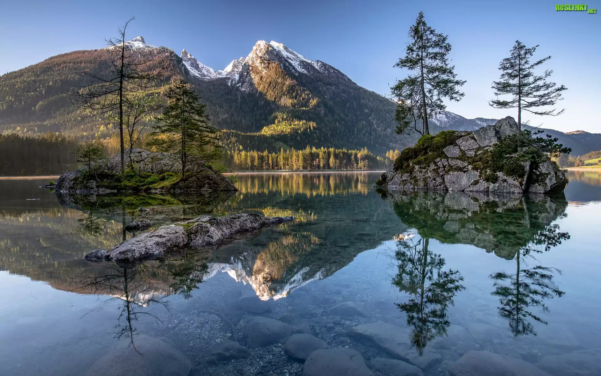 Rośliny: Góry Alpy, Jezioro Hintersee, Skały, Drzewa, Niemcy, Bawaria, Odbicie