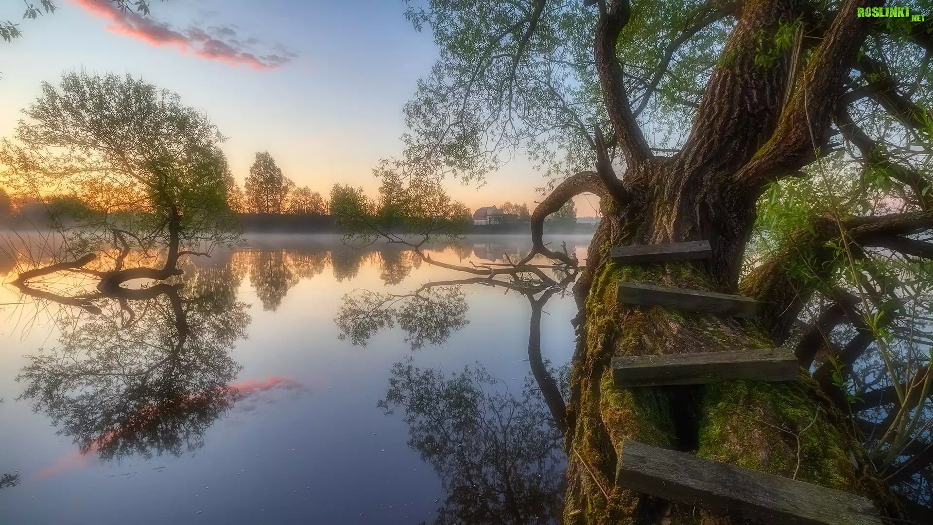Rośliny: Poranek, Jezioro, Mgła, Drzewa, Stara, Wierzba, Dom, Odbicie