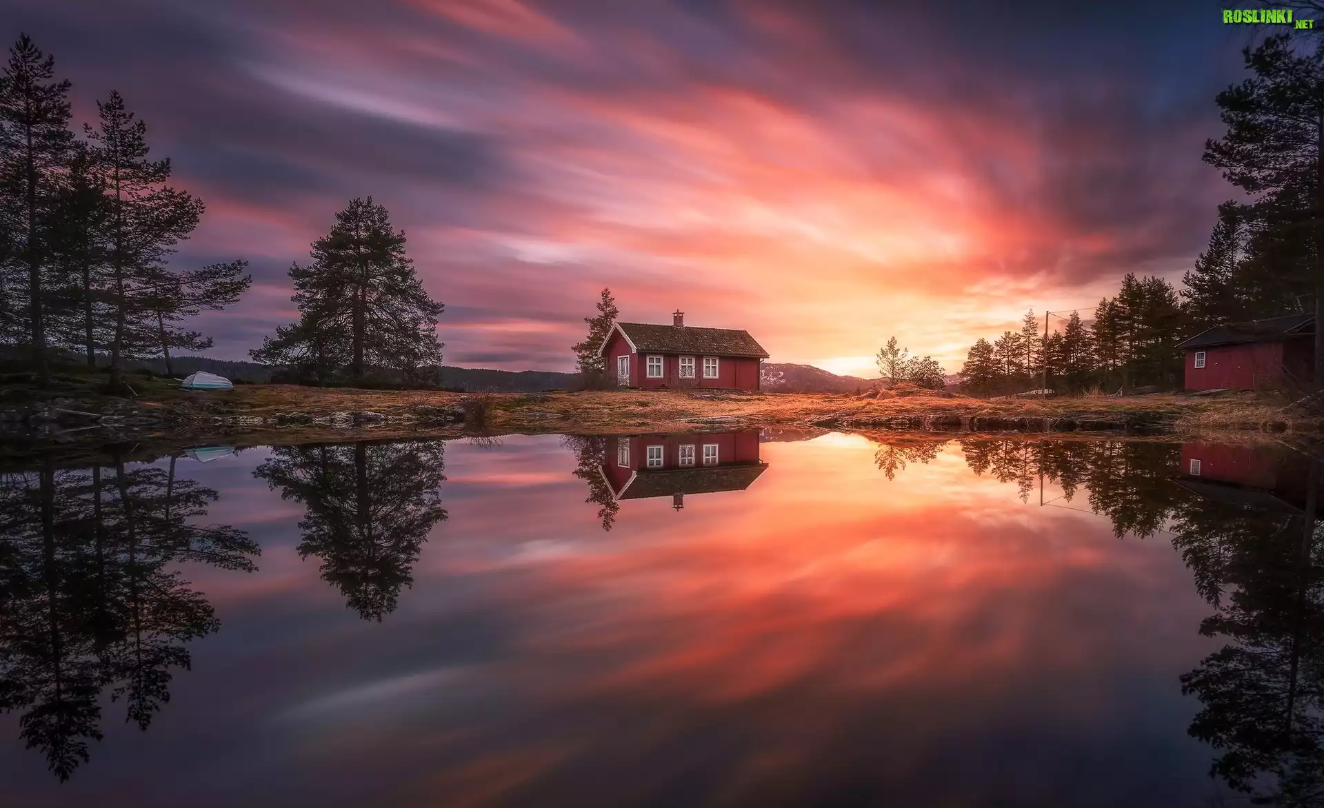 Rośliny: Norwegia, Ringerike, Jezioro Vaeleren, Łódka, Zachód słońca, Drzewa, Dom, Odbicie