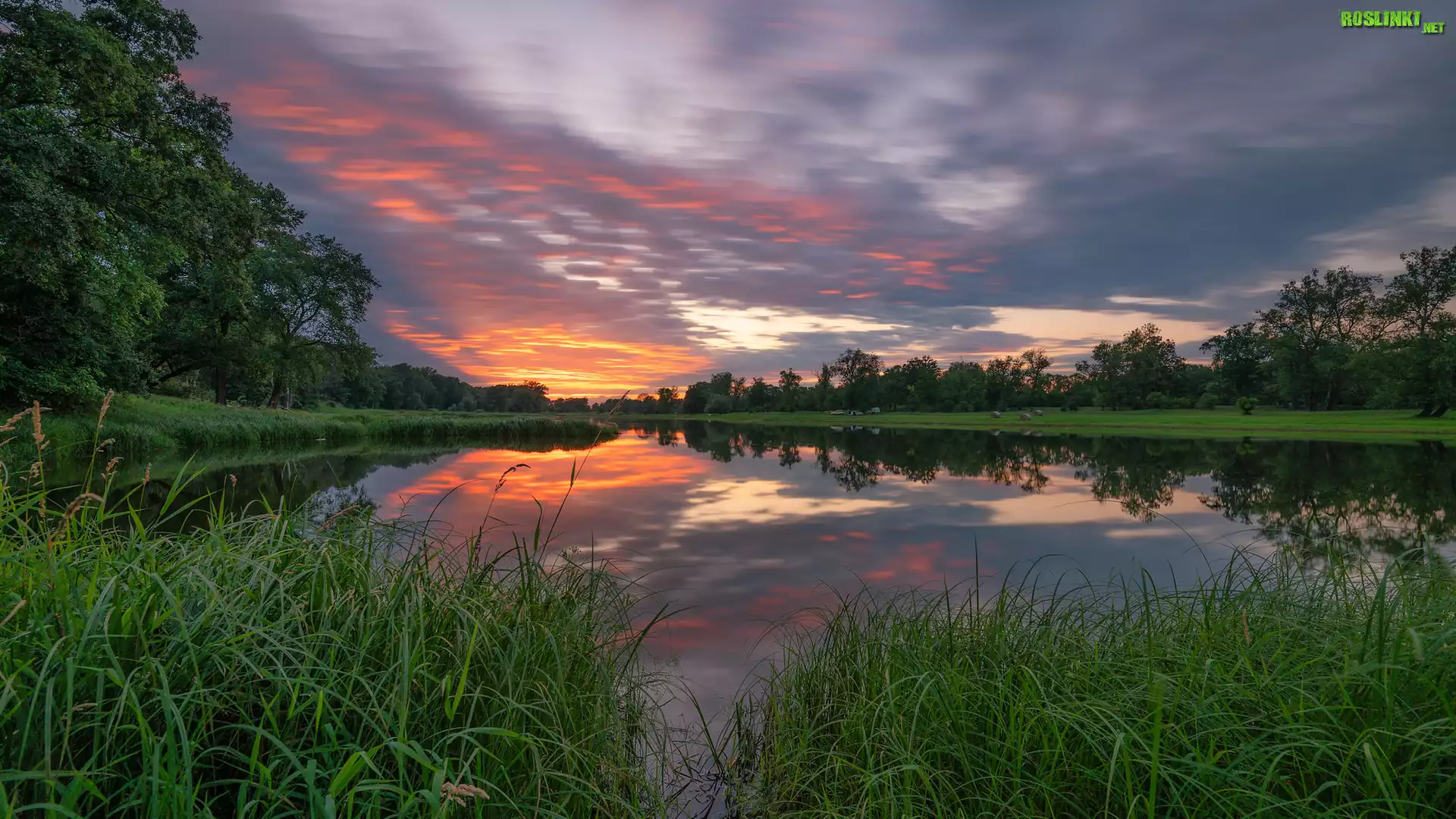 Rośliny: Jezioro, Szuwary, Drzewa, Odbicie, Zachód słońca