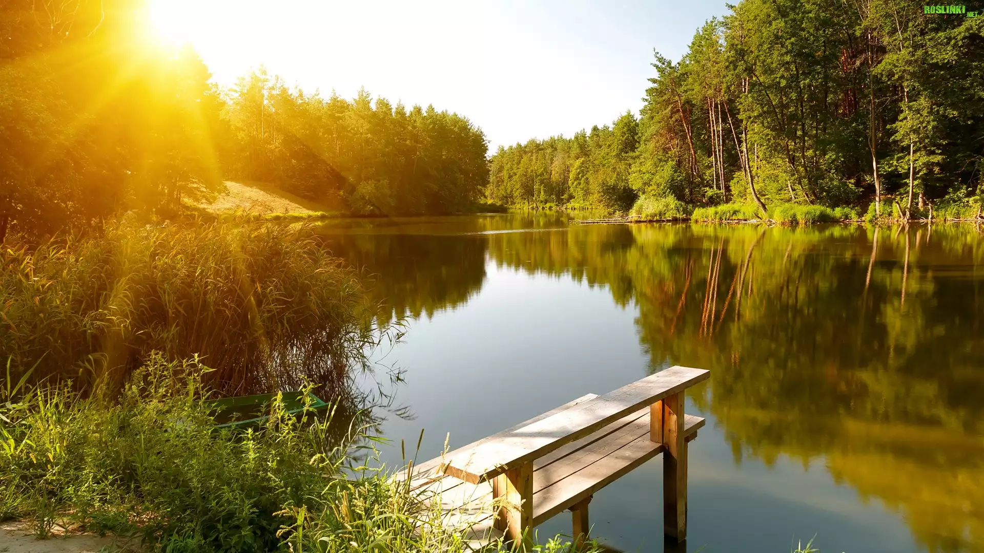 Rośliny: Promienie słońca, Las, Drzewa, Jezioro, Drewniany, Pomost, Szuwary, Łódka