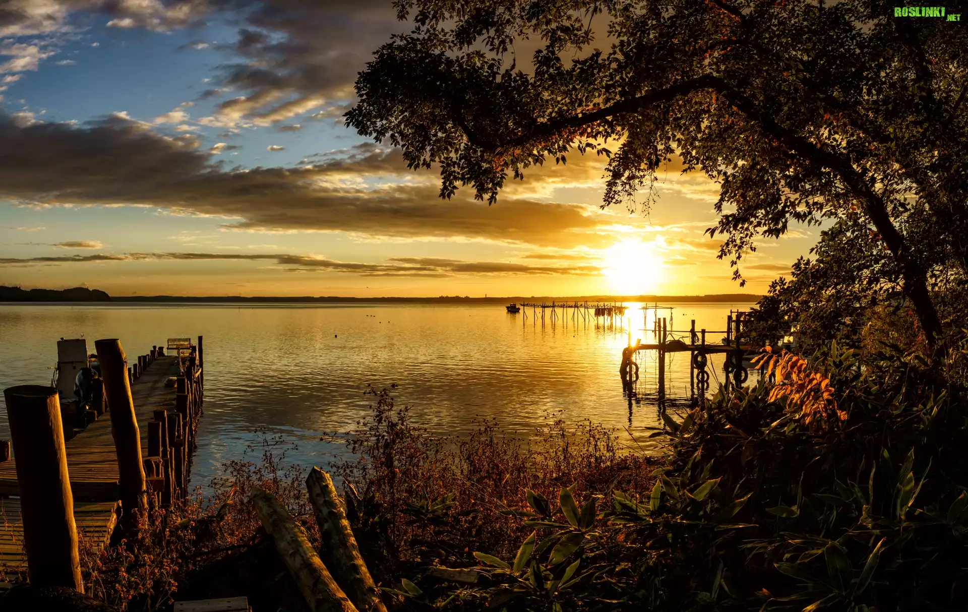 Rośliny: Jezioro Ogawara, Pomost, Drzewa, Wschód słońca, Aomori, Japonia