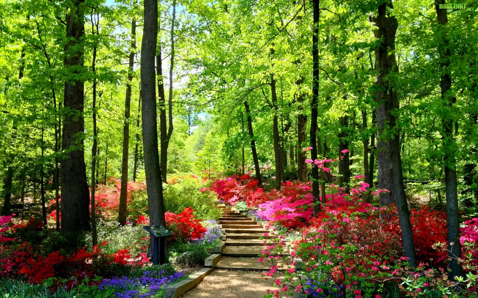 Rośliny: Ogród, Schody, Drzewa, Kwiaty