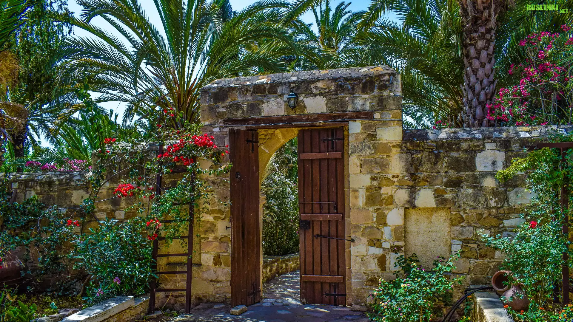 Rośliny: Ogród, Brama, Mur, Palma, Kwiaty