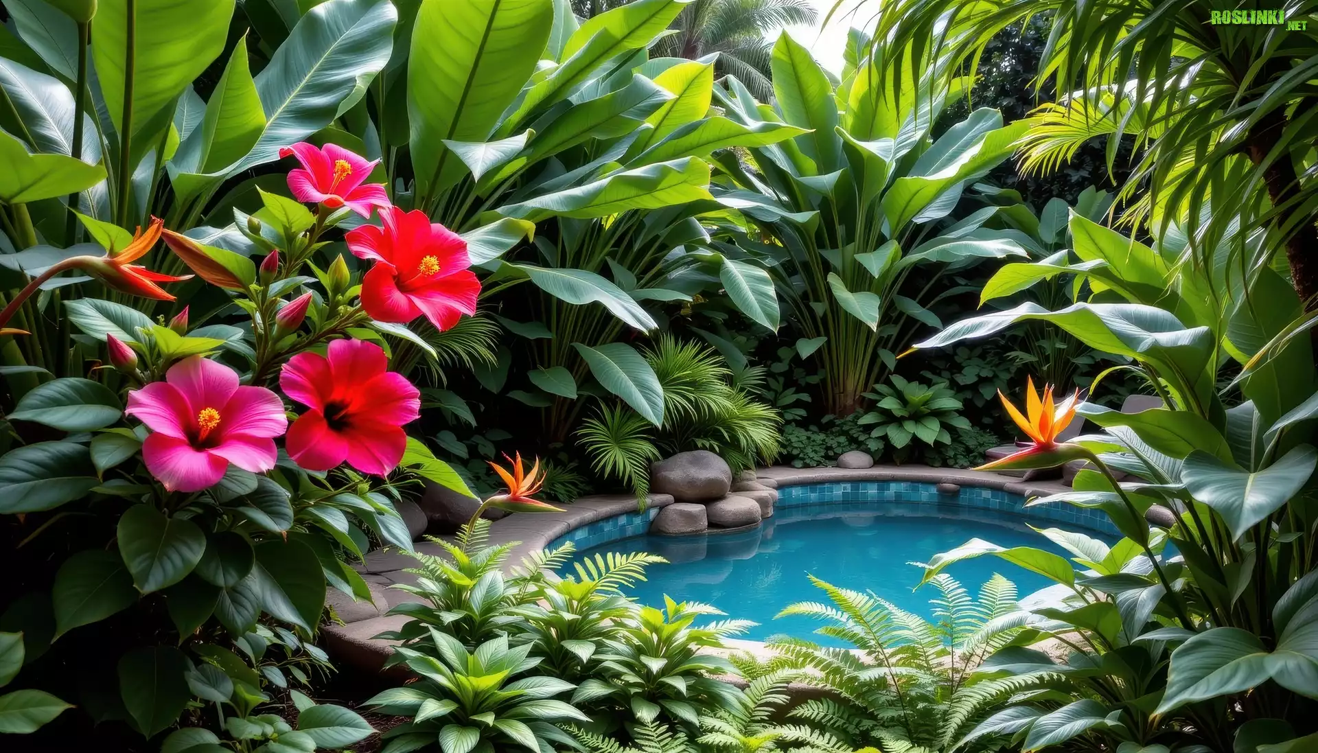 Rośliny: Ogród, Oczko wodne, Kwiaty, Czerwone, Strelicje, Paprocie, Liście, AI