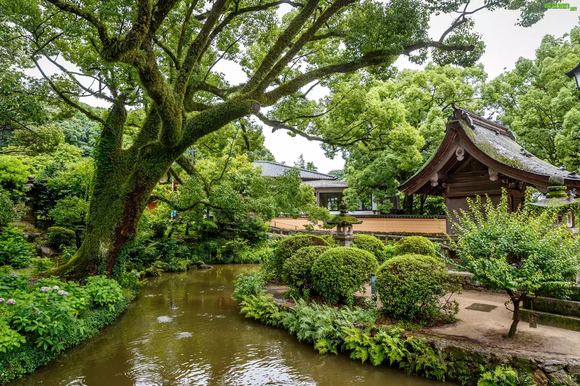 Rośliny: Park, Ogród japoński, Staw, Drzewa, Krzewy, Dom
