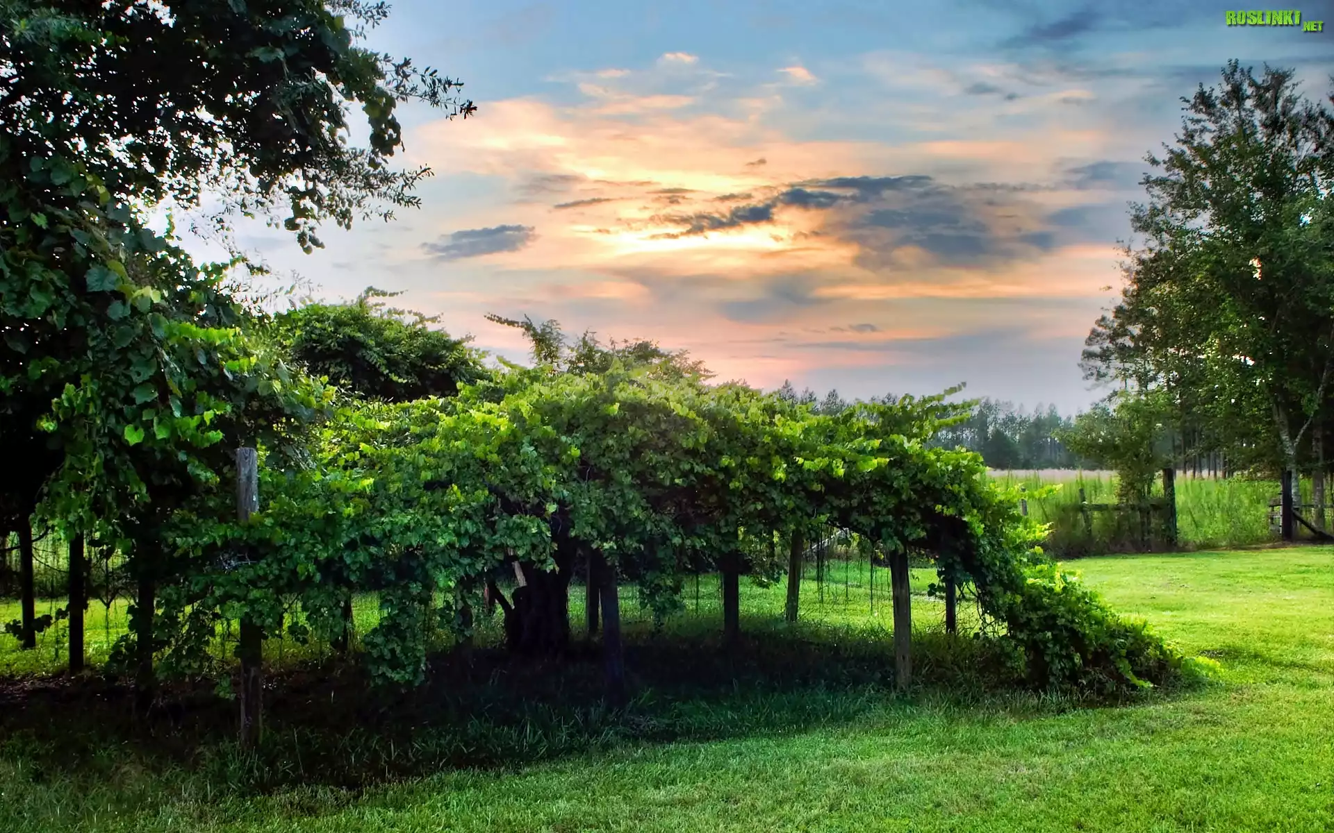 Rośliny: Ogród, Winorośl, Trawa, Chmury, Przebijające, Światło