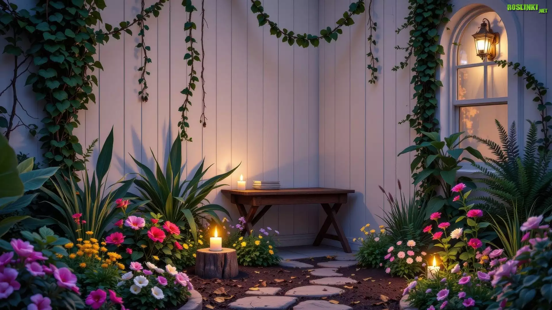 Rośliny: Kolorowe, Kwiaty, Lampion, Świece, Stół, Pnące, Rośliny, Ogródek