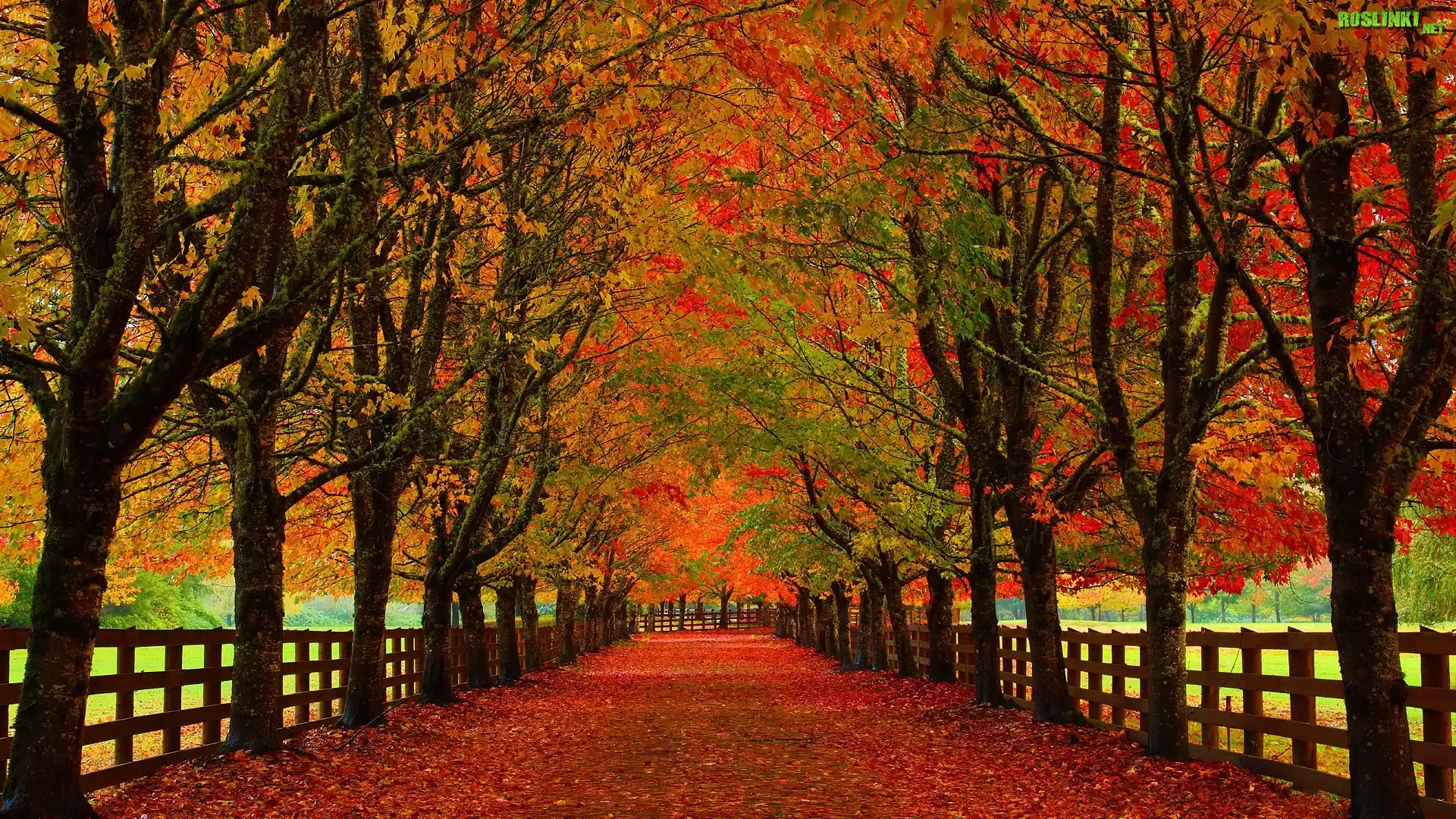 Rośliny: Jesień, Park, Alejka, Drzewa, Szpalery, Czerwone, Liście, Płot, Ogrodzenie