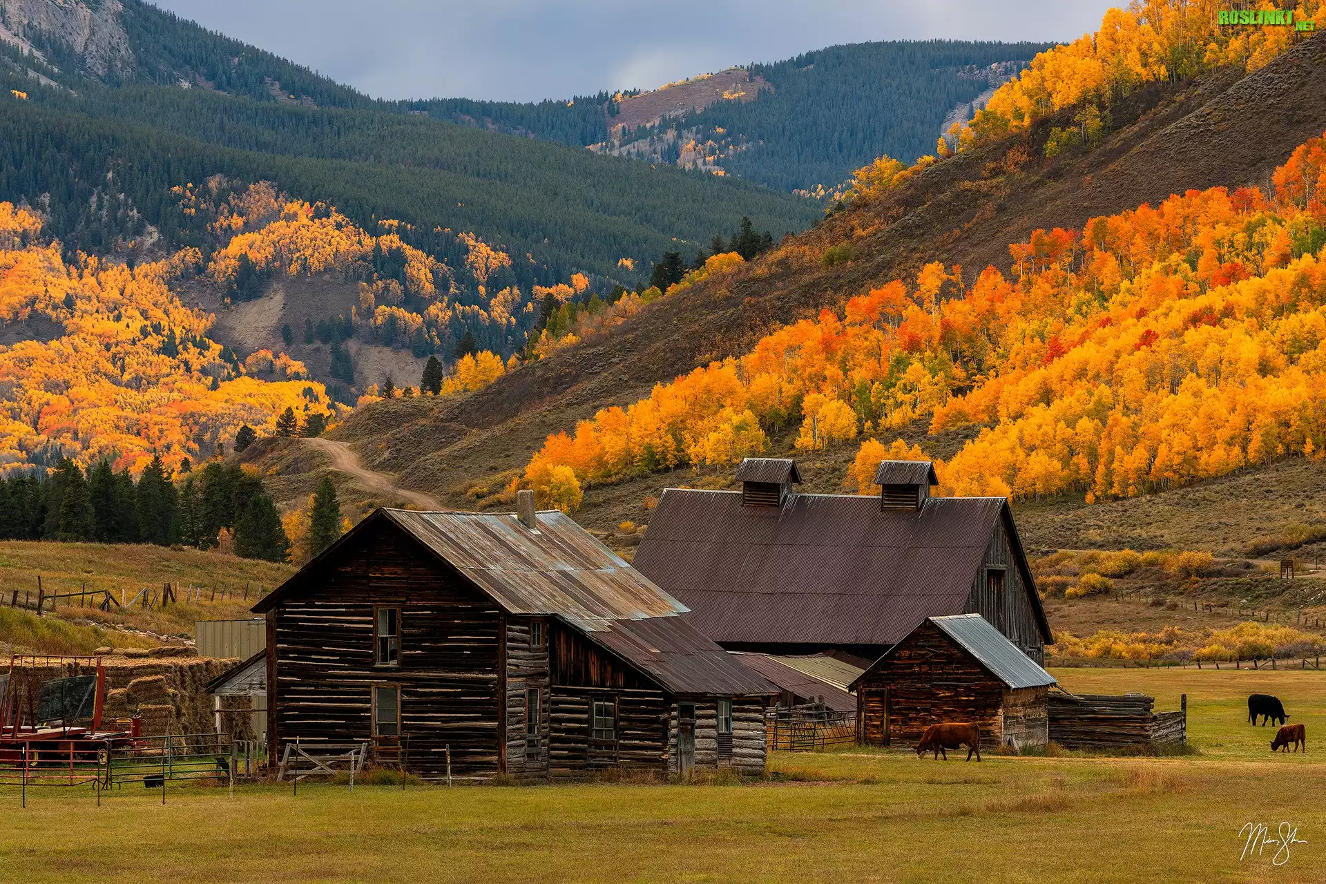 Jesień, Góry, Lasy, Pożółkłe, Drzewa, Dom, Stodoła, Ogrodzenie, Łąki, Krowy, Hrabstwo Gunnison, Kolorado, Stany Zjednoczone |